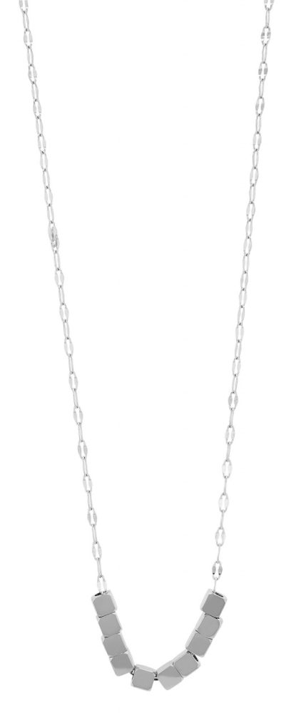 Colar em aço inoxidável “Elaia”, uma corrente elegante e intemporal. A corrente de aço inoxidável tem 43 cm de comprimento e uma extensão adicional de 5 cm para garantir um ajuste personalizado. Está disponível em duas variantes deslumbrantes para que você possa escolher sua preferência: prateado revestido com IP ou dourado. Com um fecho lagosta clássico, este colar não é apenas elegante, mas também seguro e fácil de colocar. O destaque deste colar são os 10 pingentes em forma de cubo firmemente enfiados medindo 4 x 4 mm. Esses pequenos detalhes conferem ao colar uma presença sutil, mas marcante, e o tornam atraente. A corrente de aço inoxidável incorpora beleza e elegância atemporais e é um acessório que irá acompanhá-lo durante anos.