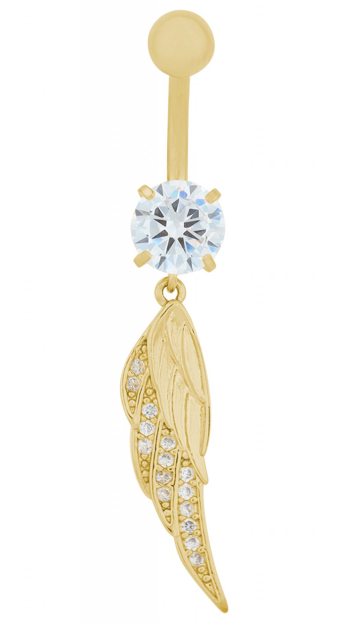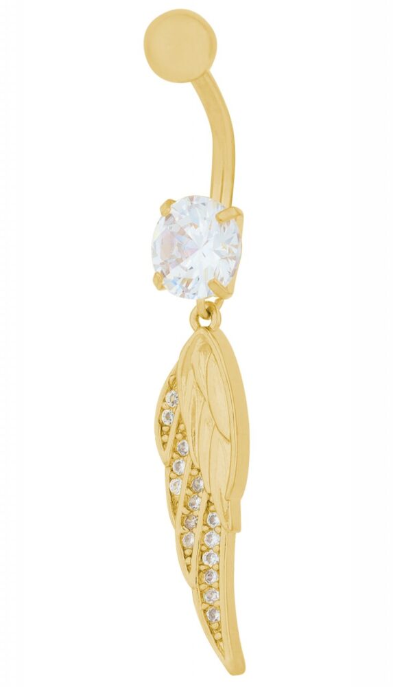 Este elegante piercing no umbigo combina elegância atemporal com design moderno. A barra de aço inoxidável de alta qualidade é cravejada com uma pedra de zircônia redonda e brilhante, o que cria uma aparência nobre. O pingente em forma de asa artisticamente desenhado dá à joia uma leveza especial e é elegantemente acentuado por sutis pedras de zircônia. Com uma barra de 11 mm de comprimento e 2 mm de espessura, o piercing oferece um ajuste confortável. O comprimento total de 46 mm garante um visual harmonioso que combina perfeitamente com qualquer roupa. Disponível em duas atraentes variações de cores.