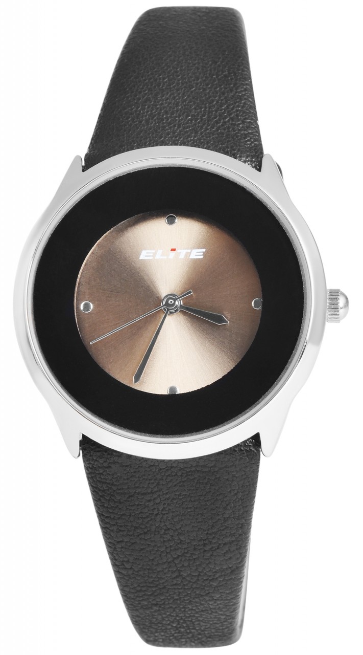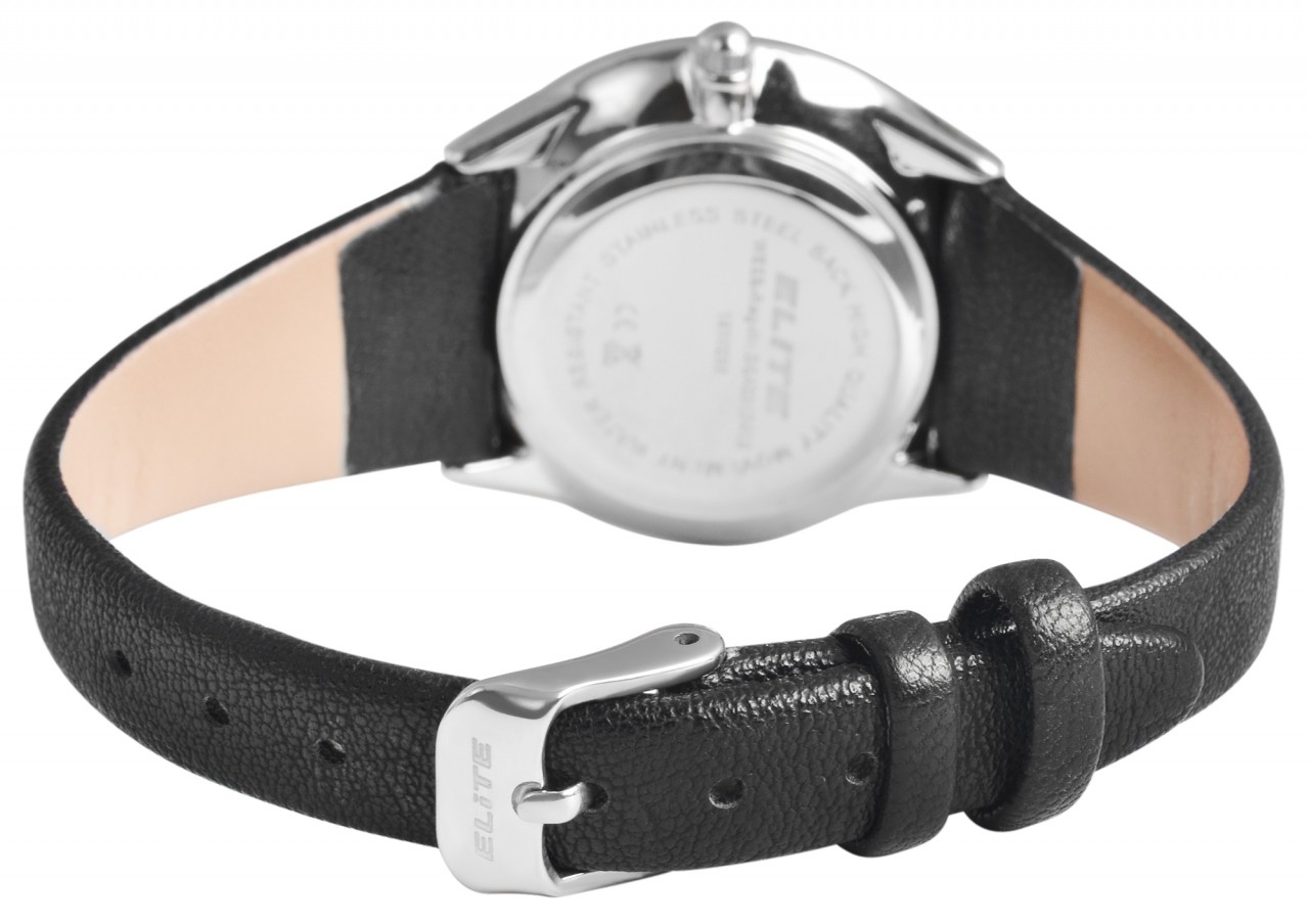 O relógio de pulso analógico de 3 ponteiros para senhora da marca Elite possui um movimento de quartzo de alta qualidade. A bracelete em imitação de pele tem 18 mm de largura na extremidade e afunila para 10 mm. Pode ser aberta e fechada com uma fivela de pino prateada. O comprimento total do relógio é de 22,5 cm. A caixa metálica prateada com vidro mineral tem um diâmetro de 32 mm e uma altura de 8 mm. O fundo da caixa é feito de aço inoxidável e o relógio é à prova de salpicos. Um destaque visual é o amplo rebordo espelhado no vidro, que é da mesma cor que a bracelete. O mostrador também é da mesma cor que a bracelete e está dividido em quatro índices de pontos prateados. Os ponteiros também são prateados. O simples relógio de senhora tem um aspeto geral harmonioso e pode ser combinado de várias formas.