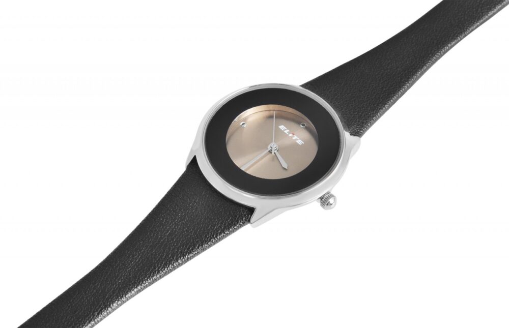O relógio de pulso analógico de 3 ponteiros para senhora da marca Elite possui um movimento de quartzo de alta qualidade. A bracelete em imitação de pele tem 18 mm de largura na extremidade e afunila para 10 mm. Pode ser aberta e fechada com uma fivela de pino prateada. O comprimento total do relógio é de 22,5 cm. A caixa metálica prateada com vidro mineral tem um diâmetro de 32 mm e uma altura de 8 mm. O fundo da caixa é feito de aço inoxidável e o relógio é à prova de salpicos. Um destaque visual é o amplo rebordo espelhado no vidro, que é da mesma cor que a bracelete. O mostrador também é da mesma cor que a bracelete e está dividido em quatro índices de pontos prateados. Os ponteiros também são prateados. O simples relógio de senhora tem um aspeto geral harmonioso e pode ser combinado de várias formas.