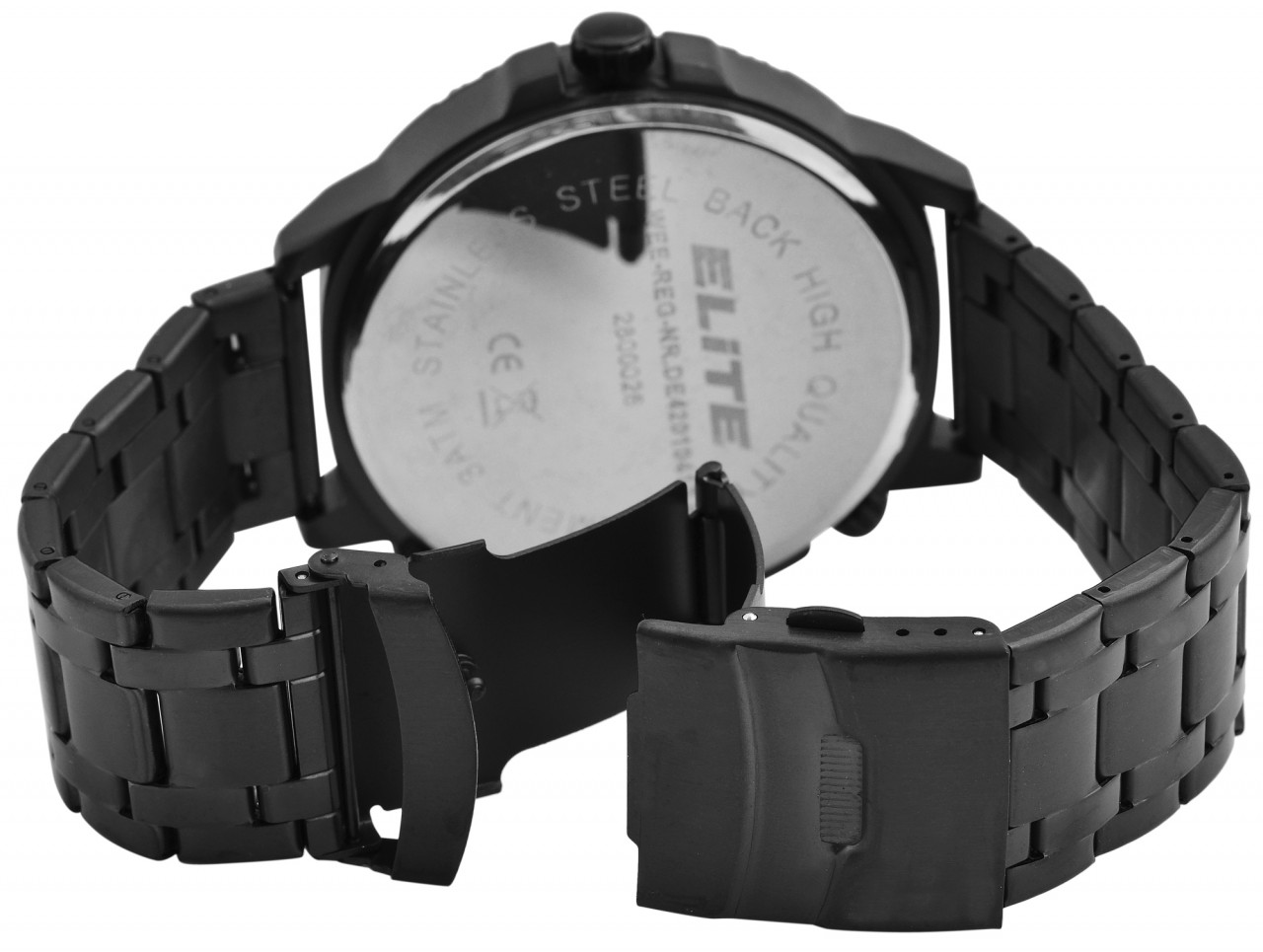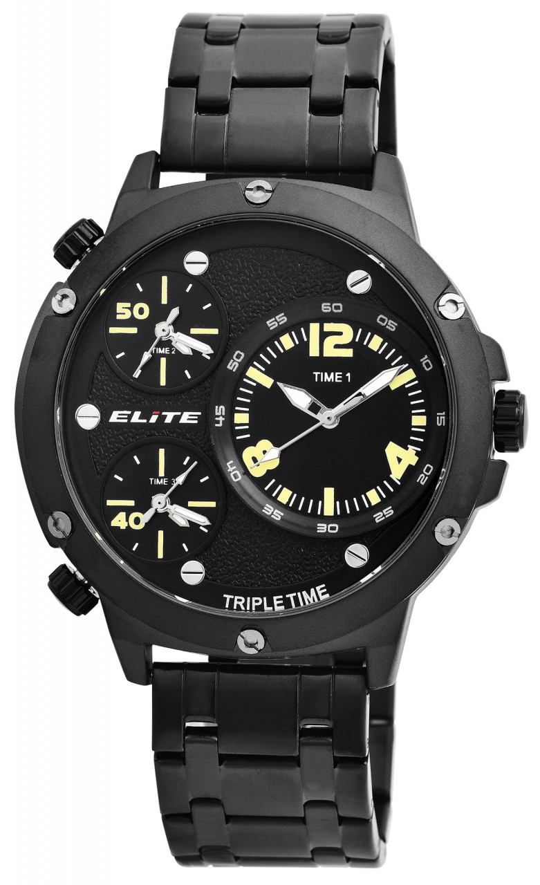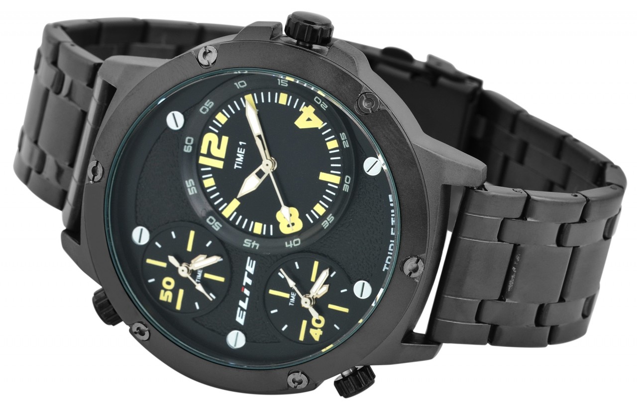 O relógio de pulso masculino da marca Elite possui 3 movimentos de quartzo de alta qualidade que exibem 3 fusos horários. Estes podem ser facilmente ajustados usando três coroas. A pulseira de elos, feita de aço inoxidável, tem uma largura de 24 mm e pode ser aberta e fechada usando um fecho dobrável de aço inoxidável incluindo uma barra de segurança. Além disso, os elementos da pulseira podem ser removidos conforme desejado, para que a circunferência possa ser ajustada a qualquer pulso. O comprimento total do relógio masculino é de 25 cm. A caixa de metal com vidro mineral tem um diâmetro de 53 mm e uma altura de 13 mm. O fundo da caixa é feito de aço inoxidável e o relógio tem resistência à água de 3 bar. Os ponteiros revestidos com Superluminova facilitam a leitura das horas mesmo no escuro.