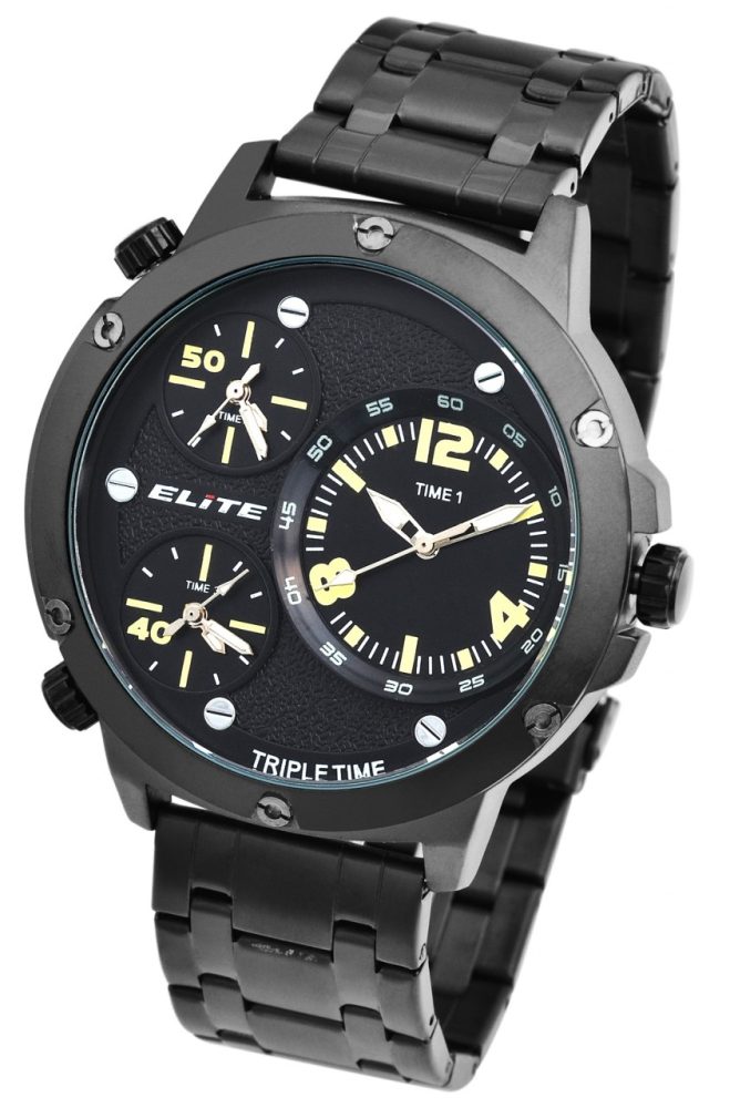 O relógio de pulso masculino da marca Elite possui 3 movimentos de quartzo de alta qualidade que exibem 3 fusos horários. Estes podem ser facilmente ajustados usando três coroas. A pulseira de elos, feita de aço inoxidável, tem uma largura de 24 mm e pode ser aberta e fechada usando um fecho dobrável de aço inoxidável incluindo uma barra de segurança. Além disso, os elementos da pulseira podem ser removidos conforme desejado, para que a circunferência possa ser ajustada a qualquer pulso. O comprimento total do relógio masculino é de 25 cm. A caixa de metal com vidro mineral tem um diâmetro de 53 mm e uma altura de 13 mm. O fundo da caixa é feito de aço inoxidável e o relógio tem resistência à água de 3 bar. Os ponteiros revestidos com Superluminova facilitam a leitura das horas mesmo no escuro.