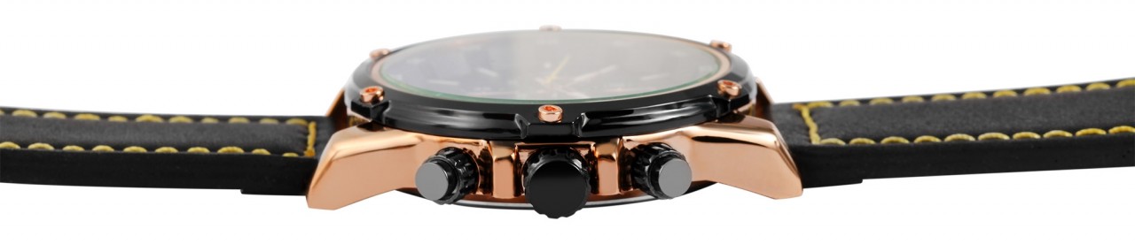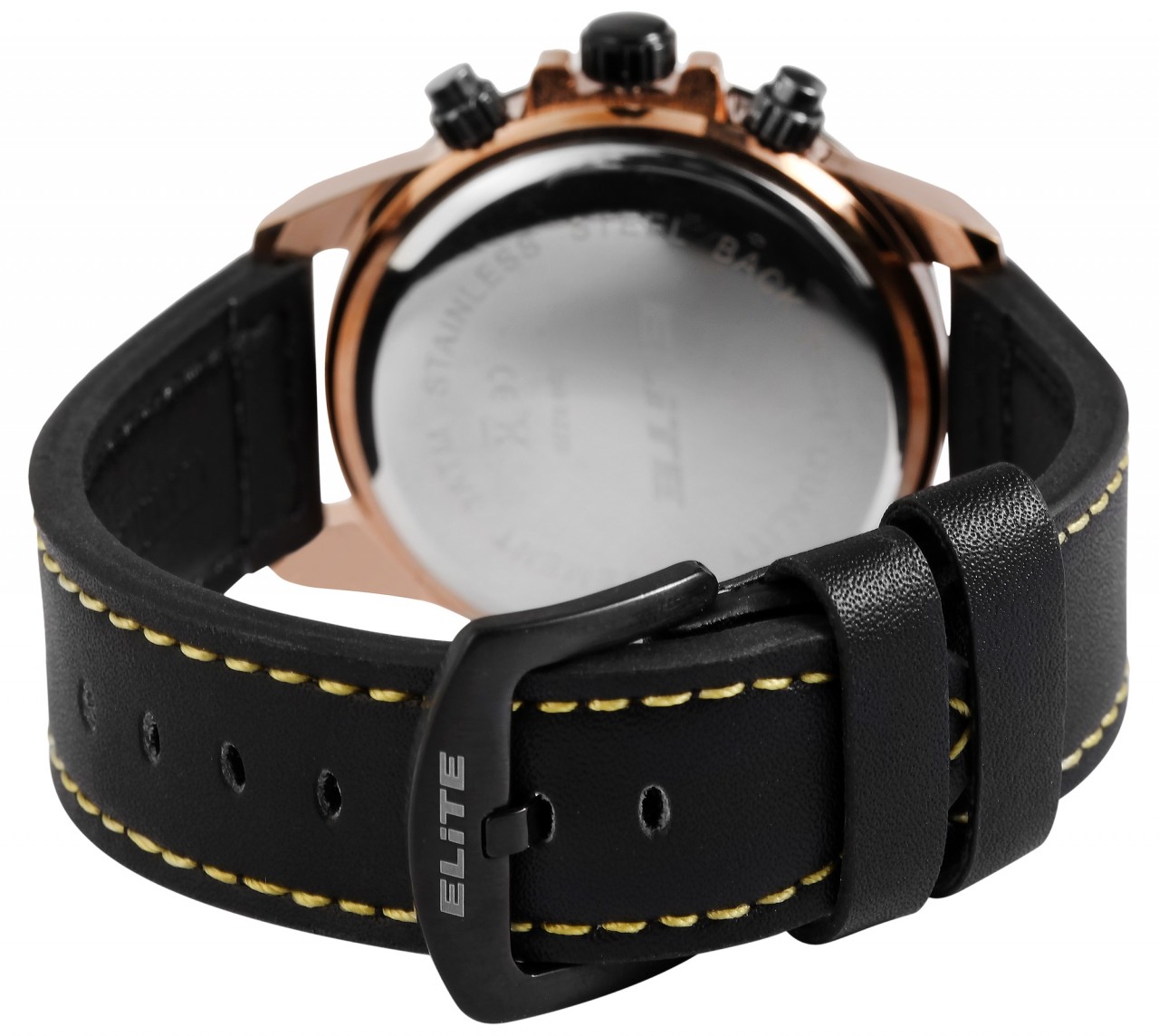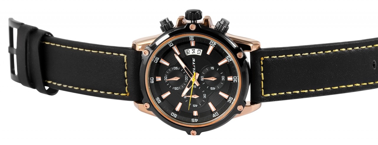 O cronógrafo masculino da marca Elite possui movimento de quartzo de alta qualidade. A pulseira de couro genuíno tem 22 mm de largura na alça e pode ser aberta e fechada com uma fivela. O comprimento total do relógio é de 26 cm. A caixa de metal com vidro mineral tem um diâmetro de 45 mm e uma altura de 12 mm. O fundo da caixa é feito de aço inoxidável. O tempo pode ser parado com o cronógrafo e depois lido nos três totalizadores às seis, nove e doze horas. O modelo também possui display de data às três horas. Os ponteiros e índices revestidos com Superluminova facilitam a leitura das horas, mesmo no escuro.…
