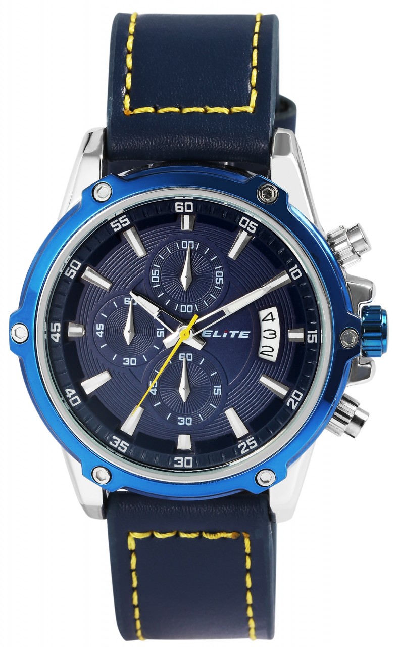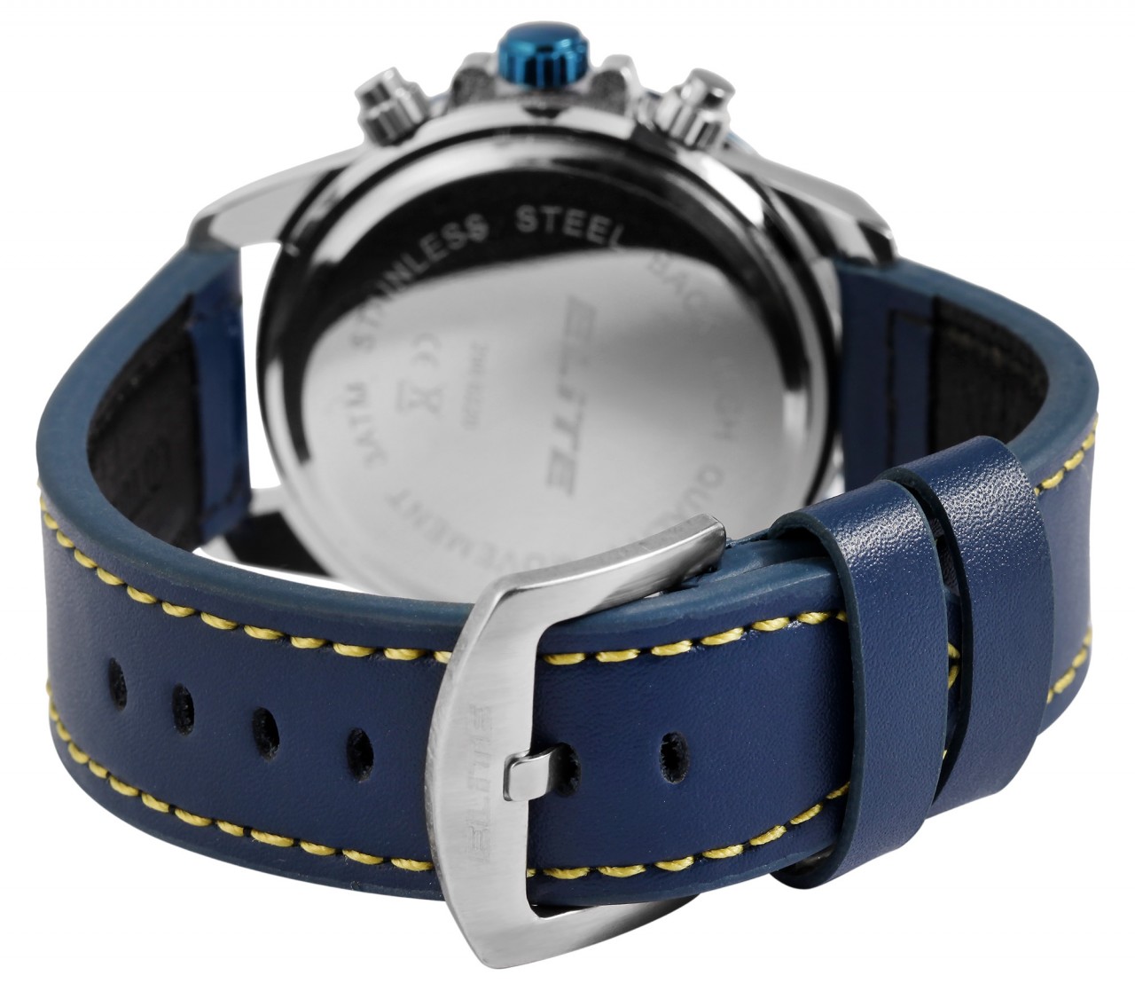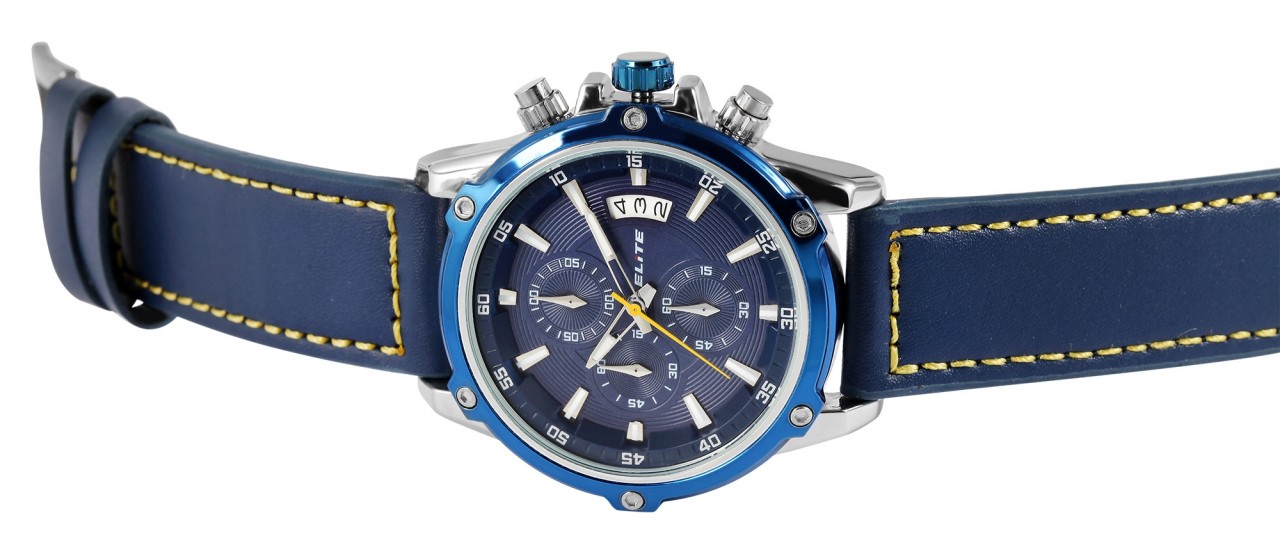O cronógrafo masculino da marca Elite possui movimento de quartzo de alta qualidade. A pulseira de couro genuíno tem 22 mm de largura na alça e pode ser aberta e fechada com uma fivela. O comprimento total do relógio é de 26 cm. A caixa de metal com vidro mineral tem um diâmetro de 45 mm e uma altura de 12 mm. O fundo da caixa é feito de aço inoxidável. O tempo pode ser parado com o cronógrafo e depois lido nos três totalizadores às seis, nove e doze horas. O modelo também possui display de data às três horas. Os ponteiros e índices revestidos com Superluminova facilitam a leitura das horas, mesmo no escuro.…