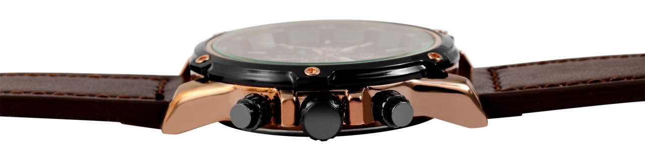 O cronógrafo masculino da marca Elite possui movimento de quartzo de alta qualidade. A pulseira de couro genuíno tem 22 mm de largura na alça e pode ser aberta e fechada com uma fivela. O comprimento total do relógio é de 26 cm. A caixa de metal com vidro mineral tem um diâmetro de 45 mm e uma altura de 12 mm. O fundo da caixa é feito de aço inoxidável. O tempo pode ser parado com o cronógrafo e depois lido nos três totalizadores às seis, nove e doze horas. O modelo também possui display de data às três horas. Os ponteiros e índices revestidos com Superluminova facilitam a leitura das horas, mesmo no escuro.…