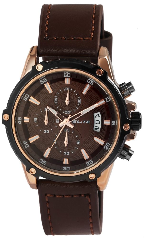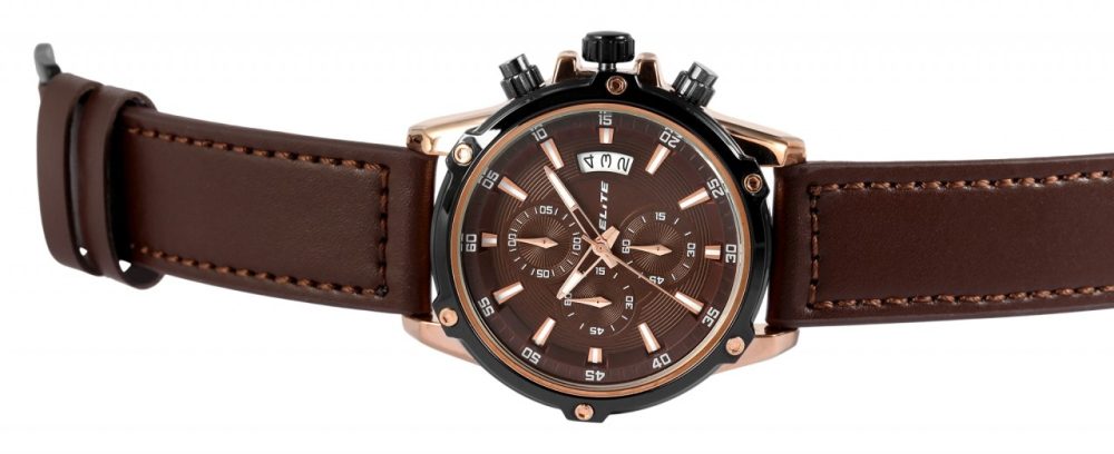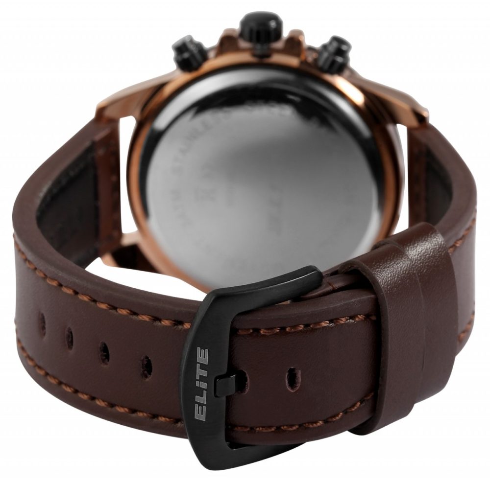 O cronógrafo masculino da marca Elite possui movimento de quartzo de alta qualidade. A pulseira de couro genuíno tem 22 mm de largura na alça e pode ser aberta e fechada com uma fivela. O comprimento total do relógio é de 26 cm. A caixa de metal com vidro mineral tem um diâmetro de 45 mm e uma altura de 12 mm. O fundo da caixa é feito de aço inoxidável. O tempo pode ser parado com o cronógrafo e depois lido nos três totalizadores às seis, nove e doze horas. O modelo também possui display de data às três horas. Os ponteiros e índices revestidos com Superluminova facilitam a leitura das horas, mesmo no escuro.…