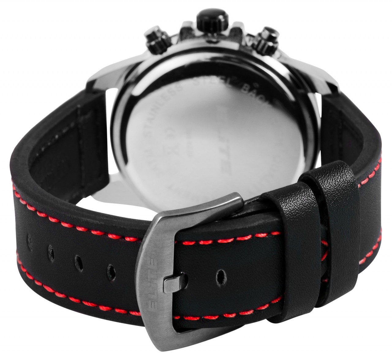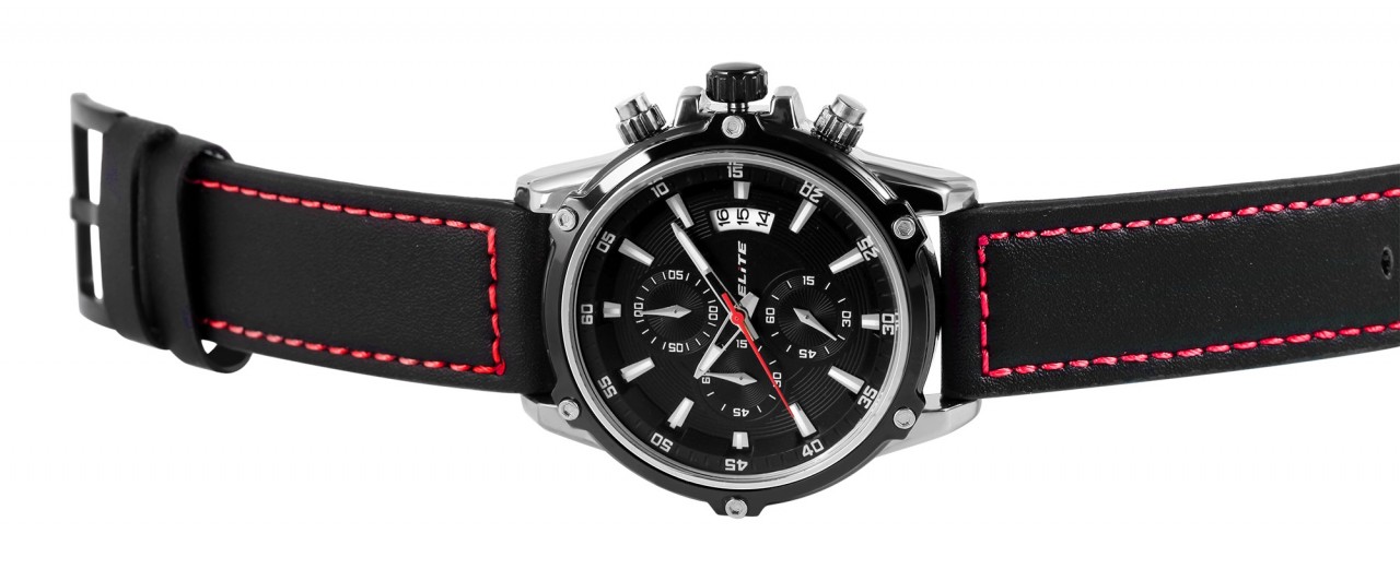 O cronógrafo masculino da marca Elite possui movimento de quartzo de alta qualidade. A pulseira de couro genuíno tem 22 mm de largura na alça e pode ser aberta e fechada com uma fivela. O comprimento total do relógio é de 26 cm. A caixa de metal com vidro mineral tem um diâmetro de 45 mm e uma altura de 12 mm. O fundo da caixa é feito de aço inoxidável. O tempo pode ser parado com o cronógrafo e depois lido nos três totalizadores às seis, nove e doze horas. O modelo também possui display de data às três horas. Os ponteiros e índices revestidos com Superluminova facilitam a leitura das horas, mesmo no escuro.…