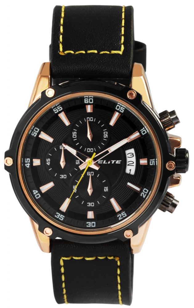 O cronógrafo masculino da marca Elite possui movimento de quartzo de alta qualidade. A pulseira de couro genuíno tem 22 mm de largura na alça e pode ser aberta e fechada com uma fivela. O comprimento total do relógio é de 26 cm. A caixa de metal com vidro mineral tem um diâmetro de 45 mm e uma altura de 12 mm. O fundo da caixa é feito de aço inoxidável. O tempo pode ser parado com o cronógrafo e depois lido nos três totalizadores às seis, nove e doze horas. O modelo também possui display de data às três horas. Os ponteiros e índices revestidos com Superluminova facilitam a leitura das horas, mesmo no escuro.…