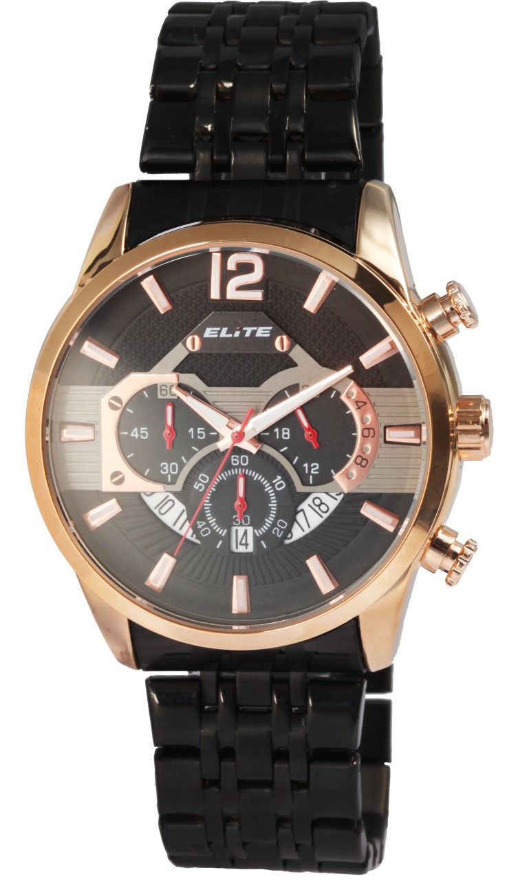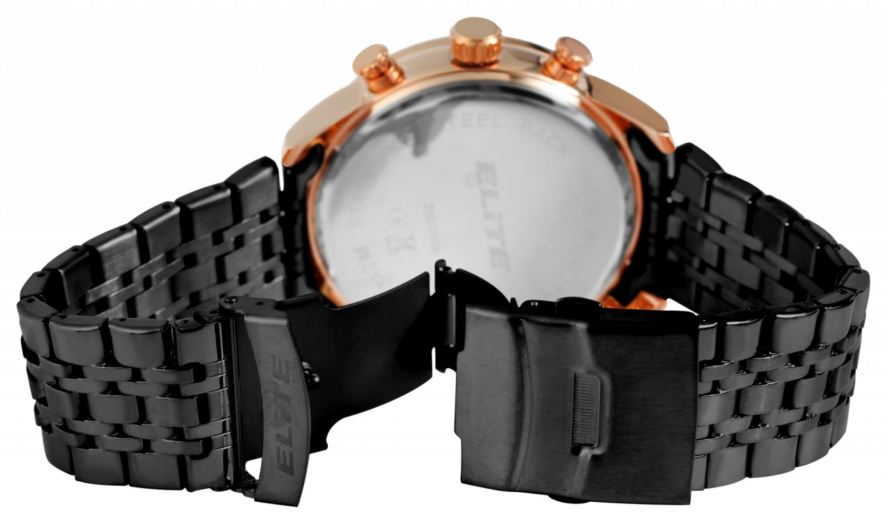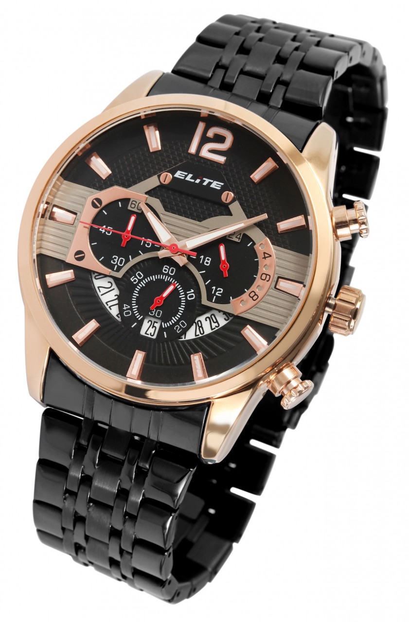 O cronógrafo masculino da marca Elite possui movimento de quartzo de alta qualidade. A pulseira de aço inoxidável tem 24 mm de largura na alça e pode ser aberta e fechada com um fecho dobrável com barra de segurança. Devido aos elementos removíveis, a pulseira pode ser ajustada a qualquer circunferência do pulso. O comprimento total do relógio é de 23,5 cm. A caixa de metal com vidro mineral tem um diâmetro de 46 mm e uma altura de 14 mm. O fundo da caixa é feito de aço inoxidável. O tempo pode ser parado com o cronógrafo e depois lido nos três totalizadores às três, seis e nove horas. O modelo também possui display de data às seis horas. Os ponteiros e índices revestidos com Superluminova facilitam a leitura das horas, mesmo no escuro. Além disso, o relógio masculino tem resistência à água de 3 bar.
