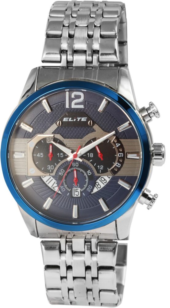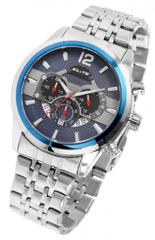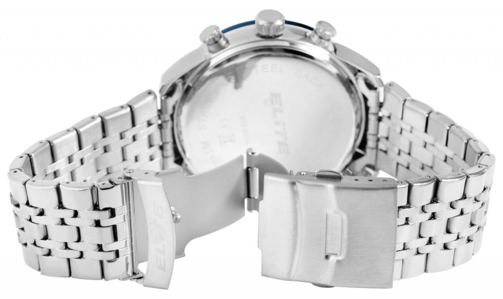 O cronógrafo masculino da marca Elite possui movimento de quartzo de alta qualidade. A pulseira de aço inoxidável tem 24 mm de largura na alça e pode ser aberta e fechada com um fecho dobrável com barra de segurança. Devido aos elementos removíveis, a pulseira pode ser ajustada a qualquer circunferência do pulso. O comprimento total do relógio é de 23,5 cm. A caixa de metal com vidro mineral tem um diâmetro de 46 mm e uma altura de 14 mm. O fundo da caixa é feito de aço inoxidável. O tempo pode ser parado com o cronógrafo e depois lido nos três totalizadores às três, seis e nove horas. O modelo também possui display de data às seis horas. Os ponteiros e índices revestidos com Superluminova facilitam a leitura das horas, mesmo no escuro. Além disso, o relógio masculino tem resistência à água de 3 bar.