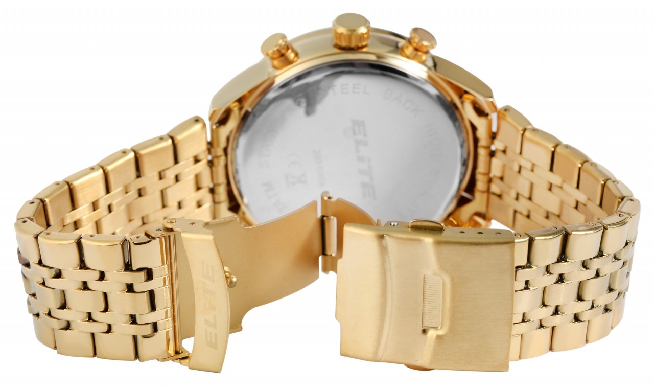 O cronógrafo masculino da marca Elite possui movimento de quartzo de alta qualidade. A pulseira de aço inoxidável tem 24 mm de largura na alça e pode ser aberta e fechada com um fecho dobrável com barra de segurança. Devido aos elementos removíveis, a pulseira pode ser ajustada a qualquer circunferência do pulso. O comprimento total do relógio é de 23,5 cm. A caixa de metal com vidro mineral tem um diâmetro de 46 mm e uma altura de 14 mm. O fundo da caixa é feito de aço inoxidável. O tempo pode ser parado com o cronógrafo e depois lido nos três totalizadores às três, seis e nove horas. O modelo também possui display de data às seis horas. Os ponteiros e índices revestidos com Superluminova facilitam a leitura das horas, mesmo no escuro. Além disso, o relógio masculino tem resistência à água de 3 bar.