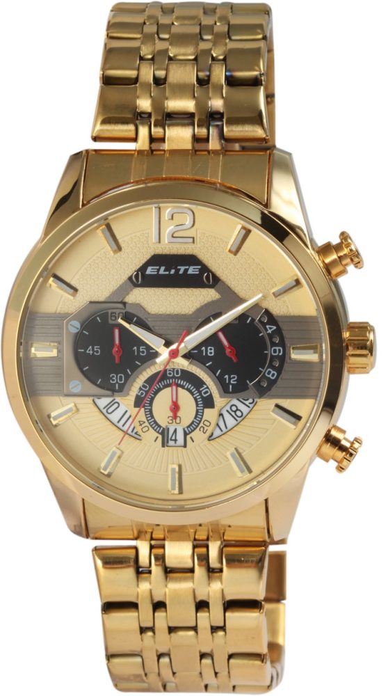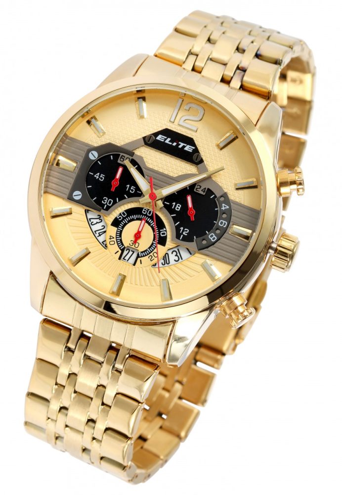 O cronógrafo masculino da marca Elite possui movimento de quartzo de alta qualidade. A pulseira de aço inoxidável tem 24 mm de largura na alça e pode ser aberta e fechada com um fecho dobrável com barra de segurança. Devido aos elementos removíveis, a pulseira pode ser ajustada a qualquer circunferência do pulso. O comprimento total do relógio é de 23,5 cm. A caixa de metal com vidro mineral tem um diâmetro de 46 mm e uma altura de 14 mm. O fundo da caixa é feito de aço inoxidável. O tempo pode ser parado com o cronógrafo e depois lido nos três totalizadores às três, seis e nove horas. O modelo também possui display de data às seis horas. Os ponteiros e índices revestidos com Superluminova facilitam a leitura das horas, mesmo no escuro. Além disso, o relógio masculino tem resistência à água de 3 bar.