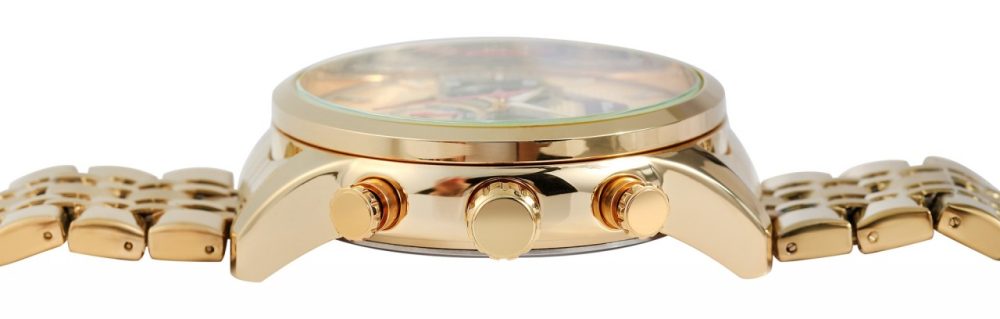 O cronógrafo masculino da marca Elite possui movimento de quartzo de alta qualidade. A pulseira de aço inoxidável tem 24 mm de largura na alça e pode ser aberta e fechada com um fecho dobrável com barra de segurança. Devido aos elementos removíveis, a pulseira pode ser ajustada a qualquer circunferência do pulso. O comprimento total do relógio é de 23,5 cm. A caixa de metal com vidro mineral tem um diâmetro de 46 mm e uma altura de 14 mm. O fundo da caixa é feito de aço inoxidável. O tempo pode ser parado com o cronógrafo e depois lido nos três totalizadores às três, seis e nove horas. O modelo também possui display de…