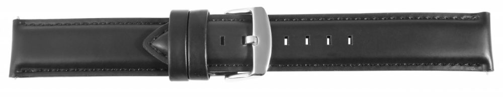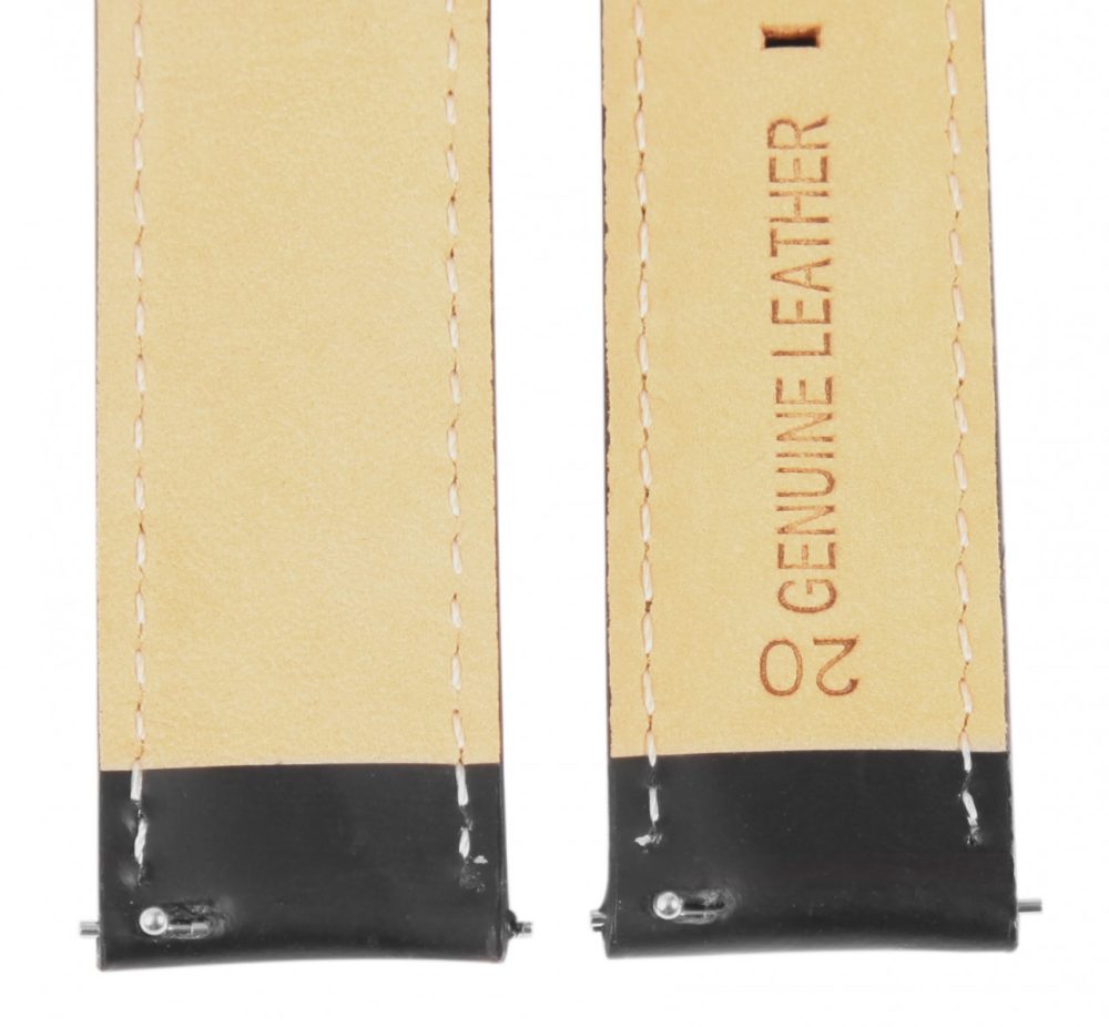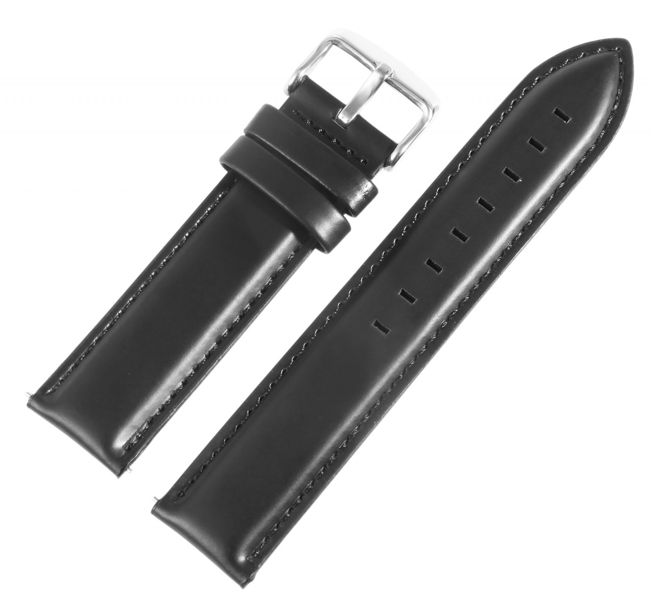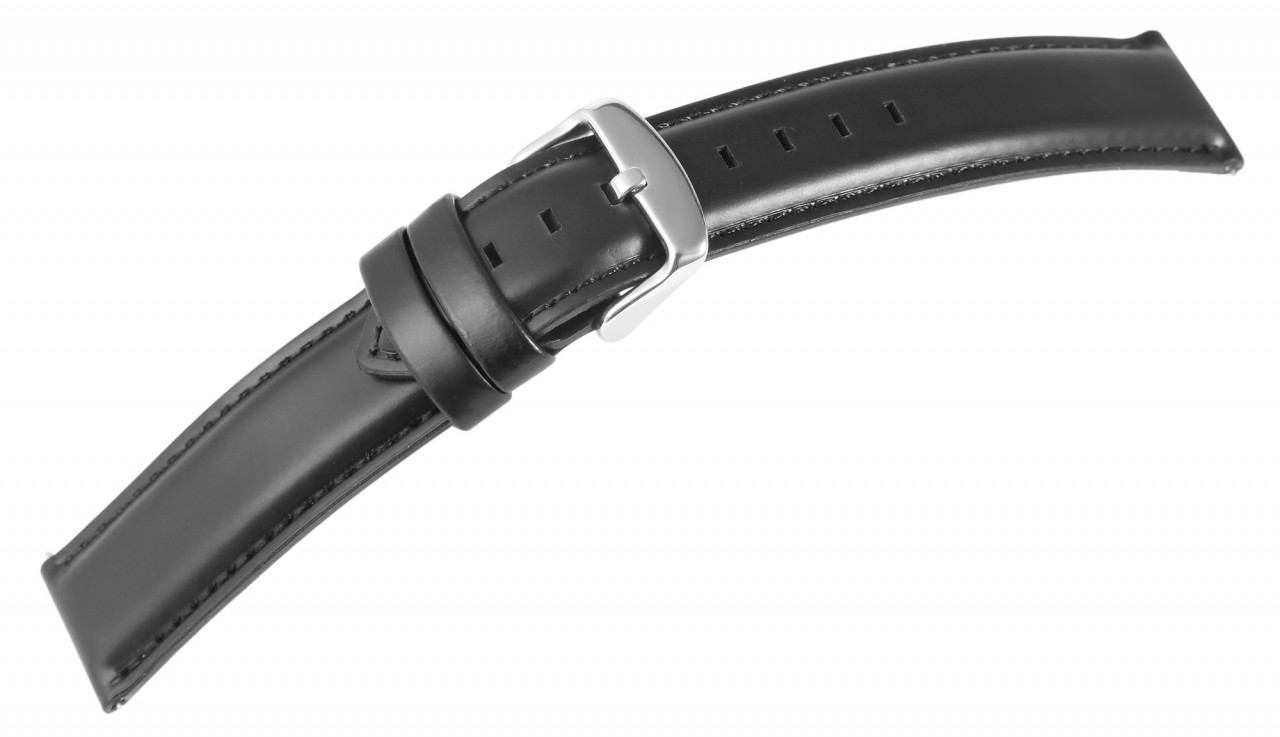 A pulseira preta do relógio é feita de couro genuíno e está disponível em larguras de 12, 14, 16, 18, 20 e 22 mm. O comprimento total da banda está entre 18,5 cm e 20,5 cm e a espessura do material é de 4 mm. O comprimento depende da largura do talão. A alça do fecho é 2 mm mais estreita que a largura da alça porque a faixa fica mais estreita ali. A pulseira de substituição pode ser aberta e fechada com uma fivela prateada altamente polida. A costura preta garante boa durabilidade e estabilidade. O acabamento brilhante em combinação com a pulseira de couro liso sublinha o belo design da pulseira do relógio e garante uma colocação e retirada rápida e fácil.