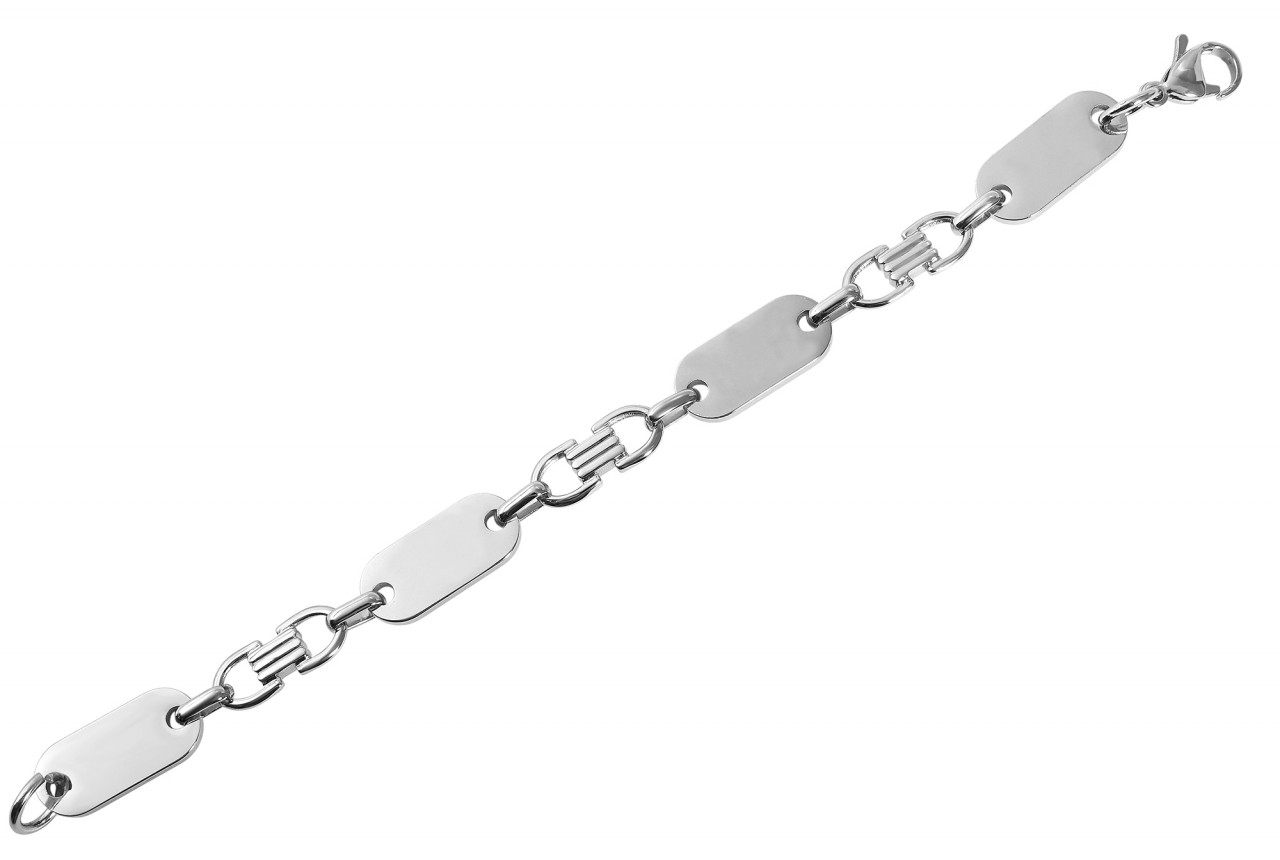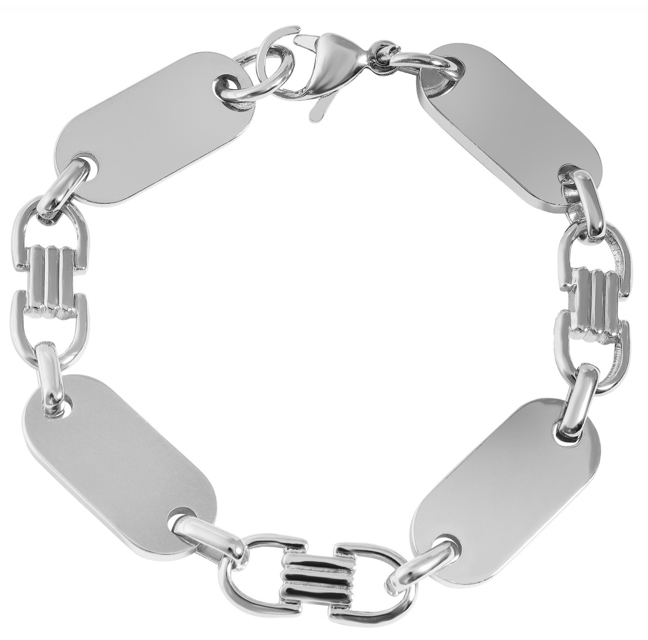 “Enid” é uma pulseira impressionante, disponível em dois comprimentos diferentes: 19 cm e 21 cm. “Enid” é uma pulseira versátil para homem e mulher e dá um toque especial a cada look. As placas de 22 x 10 mm oferecem espaço suficiente para gravações pessoais. As placas gravadas alternadas com os elementos estruturados conferem à pulseira um visual impressionante. O fecho lagosta oferece segurança e facilita a colocação e remoção da corrente.