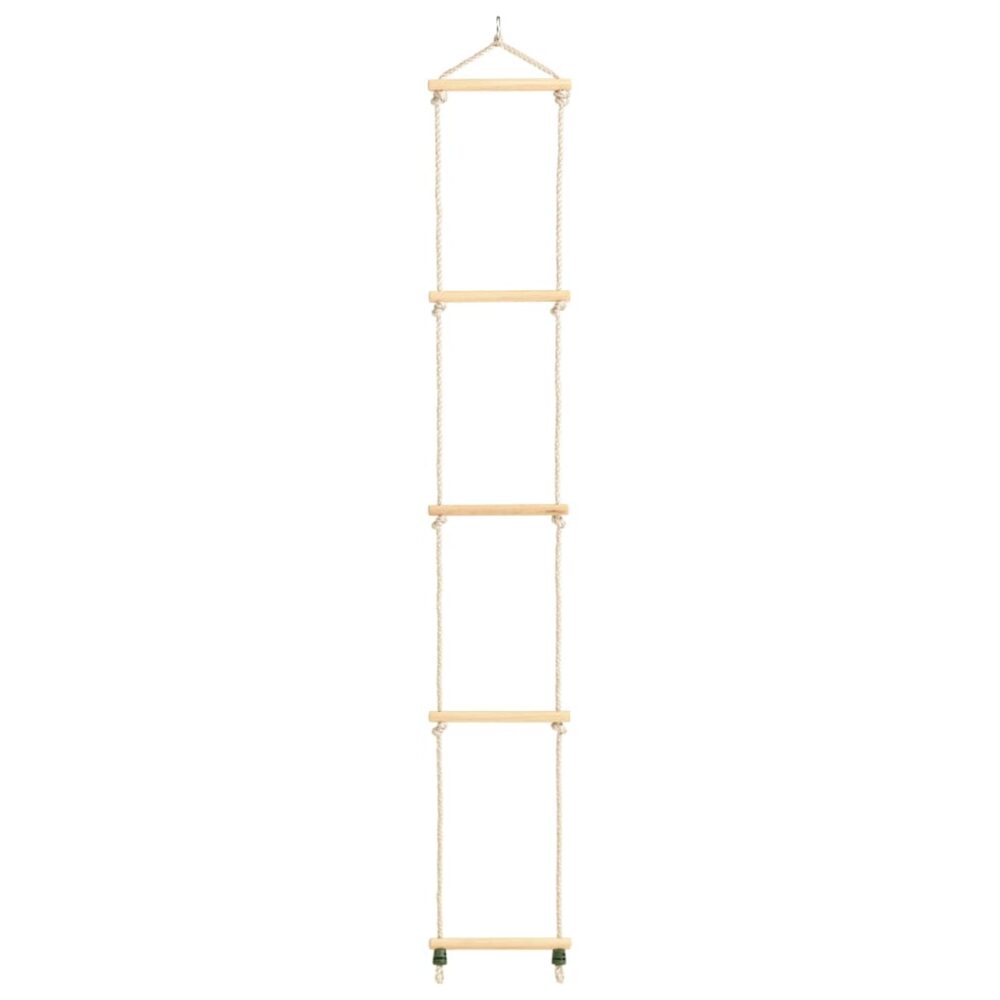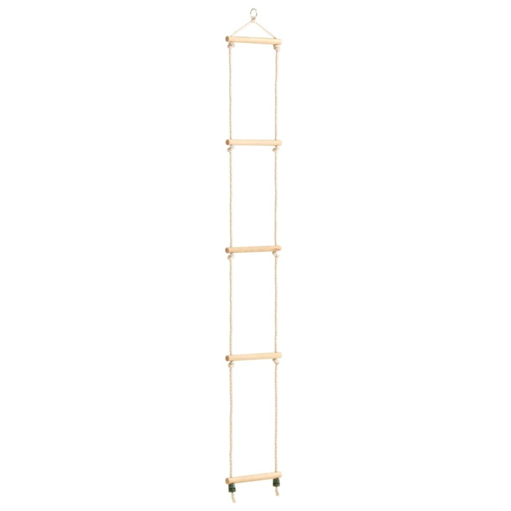 Esta escada de corda em madeira, com 5 degraus, garantirá imensa diversão aos seus filhos! Com a estrutura em madeira maciça e a corda em PE, a escada de corda é resistente, o que permite que a criança se divirta a subir e a descer. A escada é resistente às intempéries, portanto é adequada para utilização no interior e no exterior. A escada possui ainda duas extremidades de corda com anéis de suspensão para que a possa fixar num baloiço ou numa torre de brincar. Nota importante: a escada é adequada para crianças com mais de 3 anos de idade. Por razões de segurança, certifique-se de que a escada de corda é utilizada mediante a supervisão direta de um adulto.