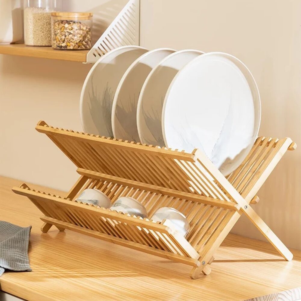 O escorredor de pratos tem uma prateleira superior para os pratos e uma prateleira na parte de baixo para copos, tigelas.