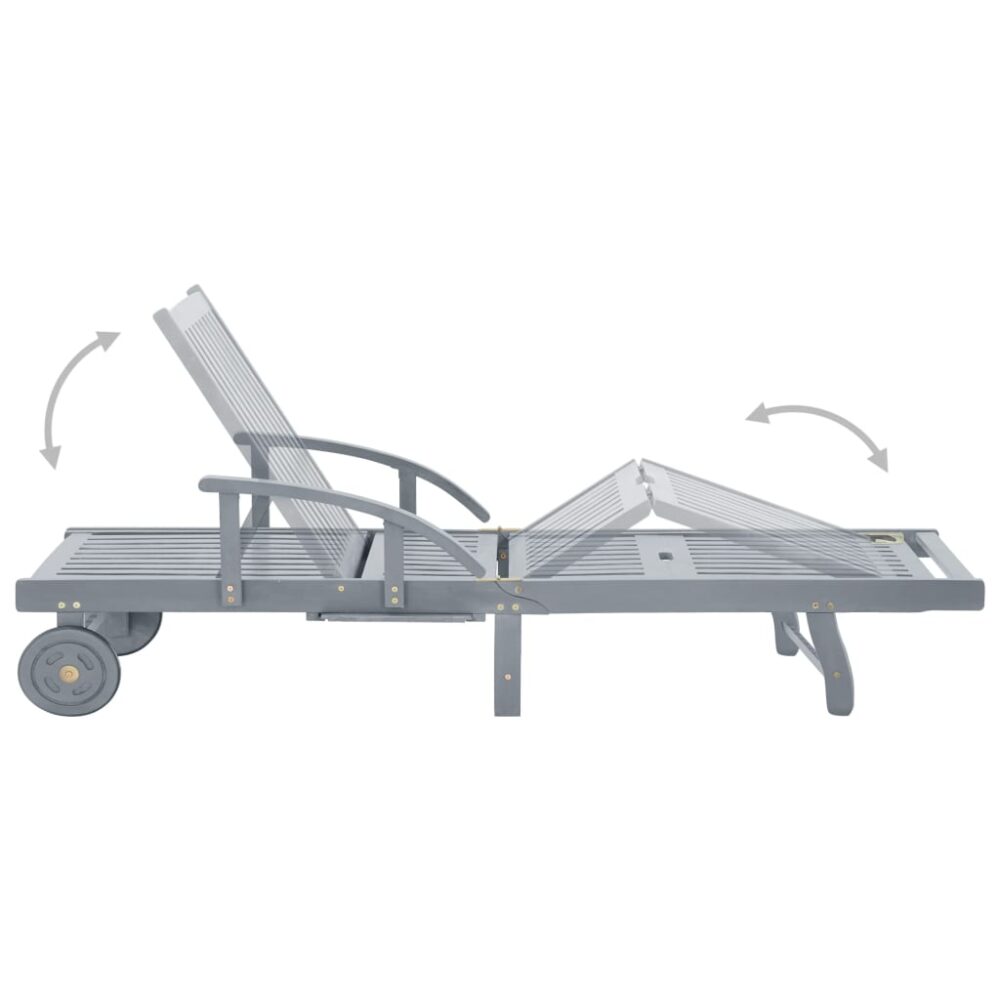Esta espreguiçadeira é feita em madeira de acácia maciça com um acabamento a cinzento lavado, o que a torna resistente e estável. O encosto e o apoio de pés são ajustáveis. Pode ainda bloquear a espreguiçadeira na posição desejada. Esta espreguiçadeira de jardim pode ser facilmente deslocada pela casa uma vez que possui 2 rodas. A espreguiçadeira possui também uma mesa extensível conveniente onde poderá colocar o seu telefone, óculos de sol, bebidas e outros artigos pequenos. O almofadão atribui um conforto adicional enquanto relaxa. Cada almofadão possui seis conjuntos de tiras para que os possa fixar bem na espreguiçadeira.