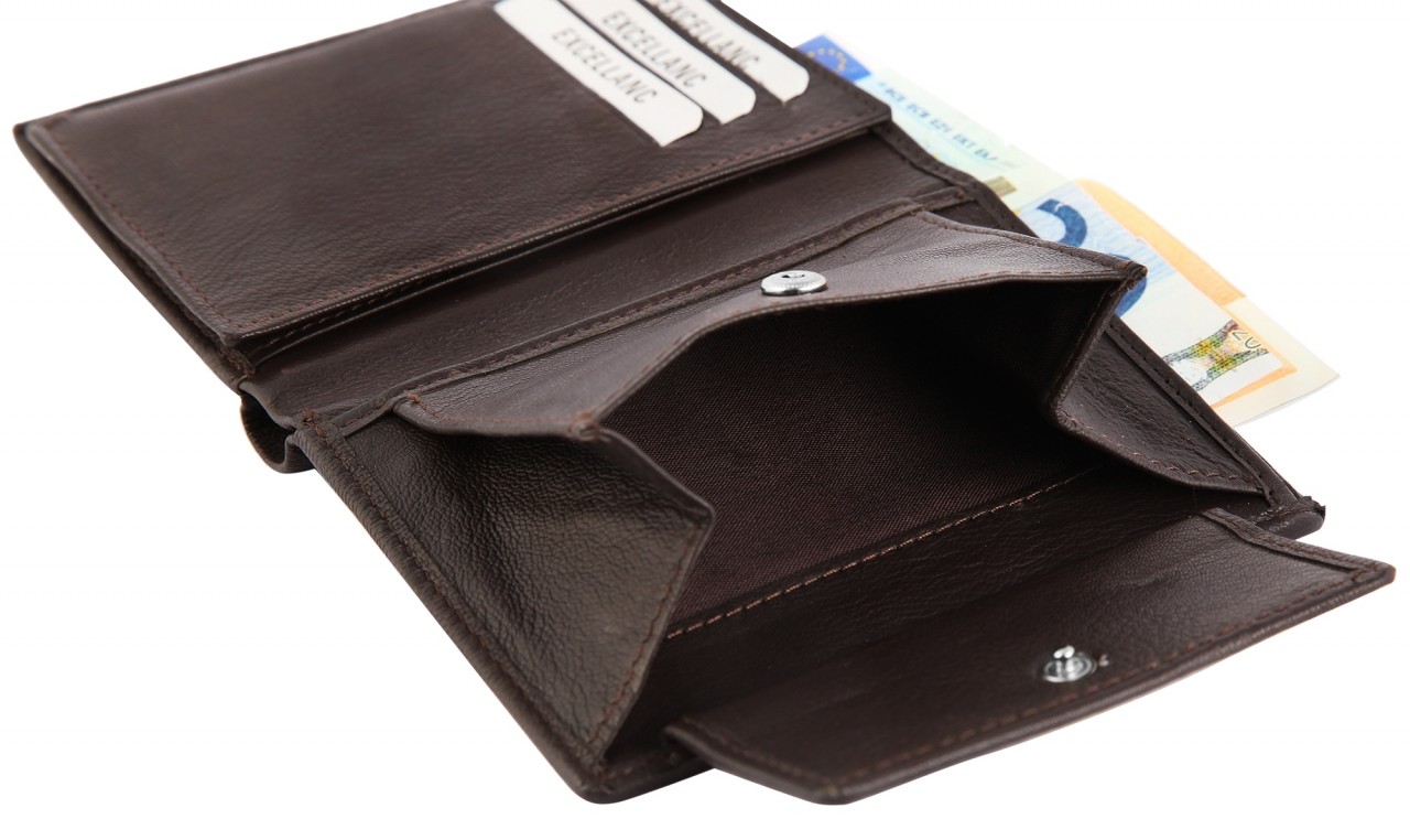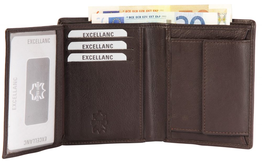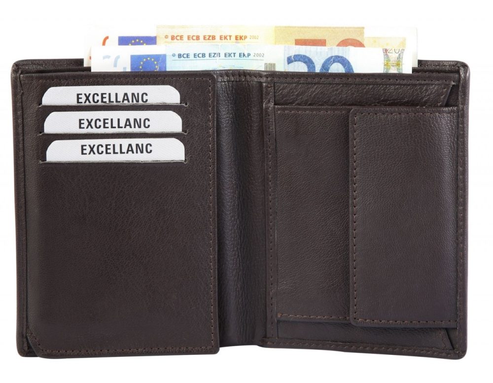 A carteira está dividida em 6 compartimentos para cartões de crédito, 2 compartimentos para notas, 1 compartimento para moedas, 2 bolsos. O tamanho, sem preenchimento, tem 12 cm de comprimento, 9 cm de largura e 2 cm de espessura.