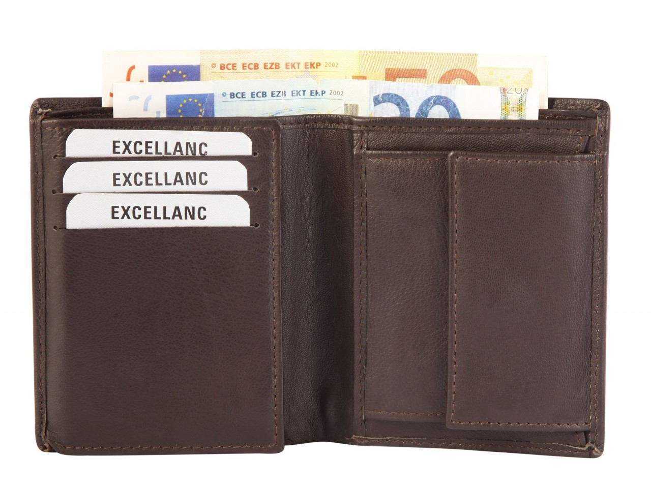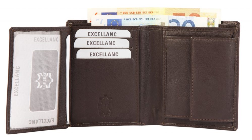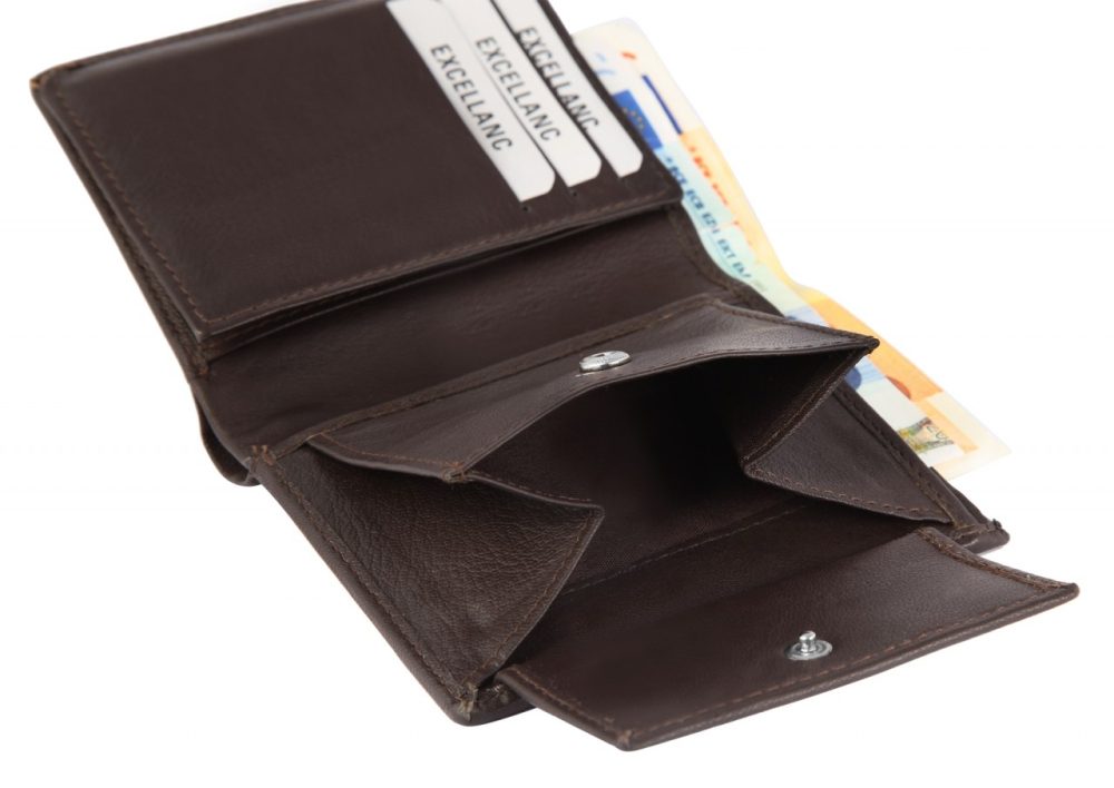 A carteira está dividida em 6 compartimentos para cartões de crédito, 2 compartimentos para notas, 1 compartimento para moedas, 2 bolsos. O tamanho, sem preenchimento, tem 11 cm de comprimento, 8.5 cm de largura e 2 cm de espessura.