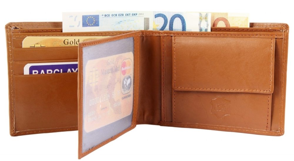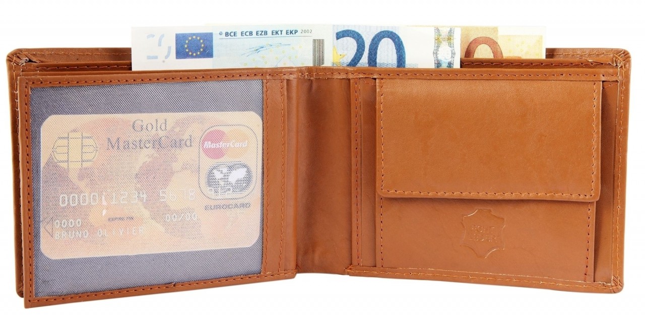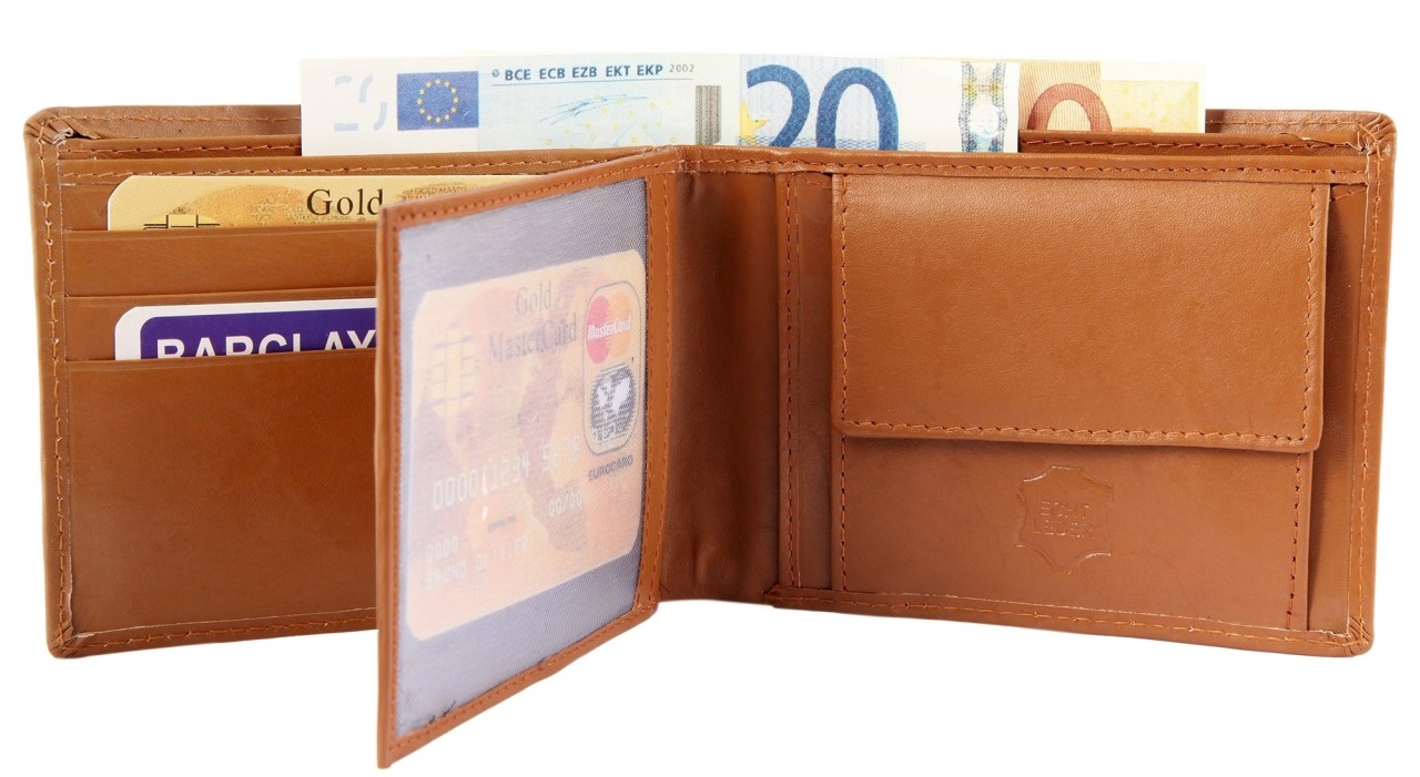 Carteira masculina Excellanc em couro genuíno. A carteira paisagem tem 12 cm de largura e 10 cm de altura. A cor é. Possui 2 compartimentos para notas, um compartimento para trocos, 6 compartimentos para cartões de crédito e um compartimento transparente para identificação.