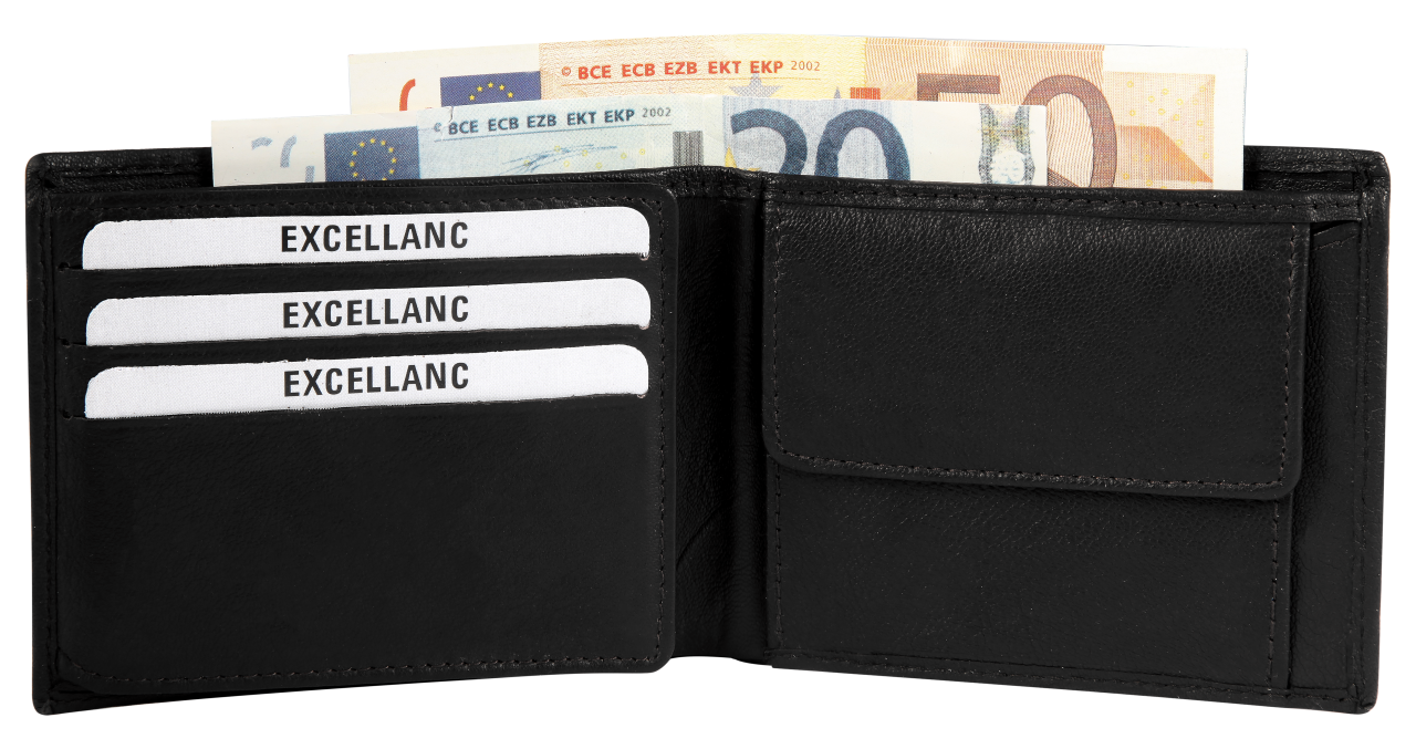 A carteira da marca Excellanc foi confeccionada em formato paisagem em couro genuíno. Tem comprimento de 8,6 cm, largura de 10,4 cm e espessura do material de 2,1 cm quando não preenchido. A bolsa impressiona pelo design simples e pela capacidade de armazenar documentos importantes. Graças à divisão confortável, possui 2 compartimentos para notas, 1 compartimento para moedas com fecho de botão de pressão, 6 compartimentos para cartões de crédito, 1 compartimento transparente para identificação e 2 bolsos deslizantes. Pequena, compacta e leve – a carteira é versátil e cabe em todos os bolsos. É também a ideia de presente ideal para ele e ela.