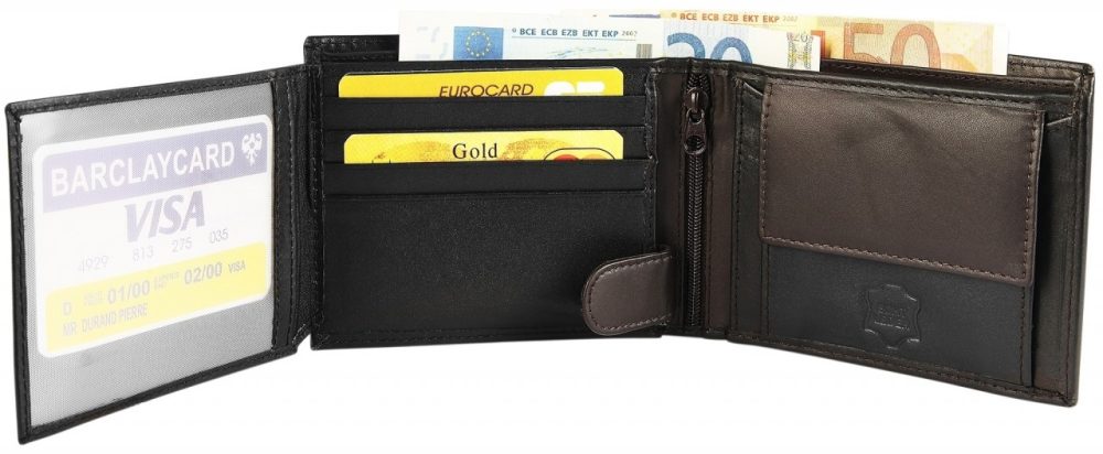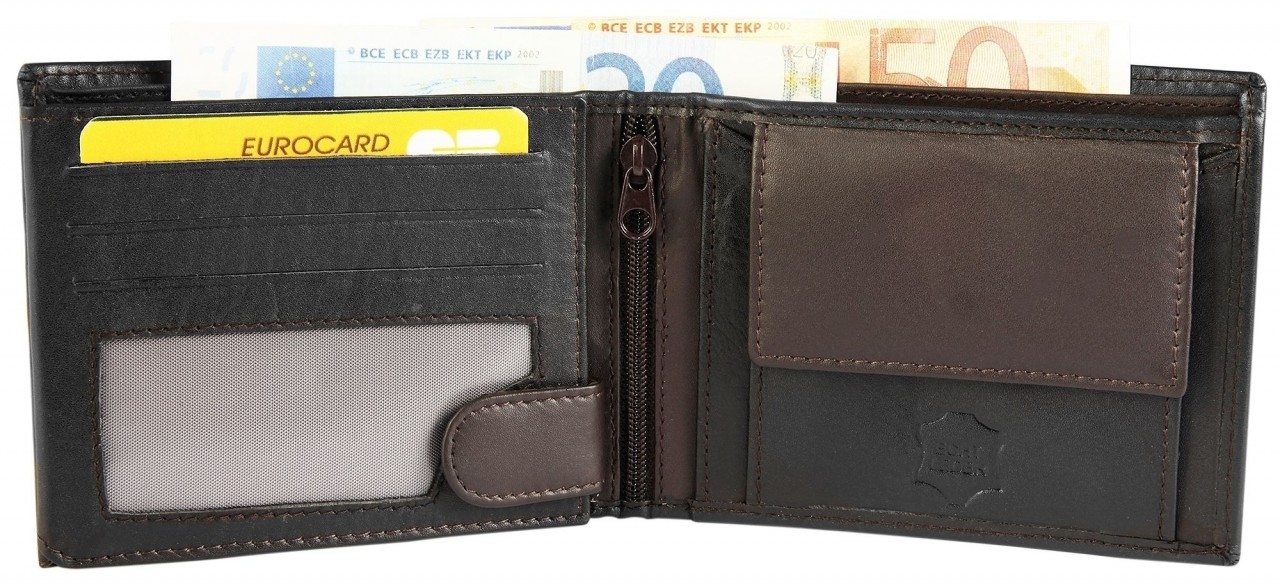 Carteira masculina Excellanc em couro genuíno. A carteira paisagem tem 12 cm de largura e 10 cm de altura. A cor é. Possui 2 compartimentos para notas, um compartimento para trocos, 6 compartimentos para cartões de crédito, um compartimento transparente para cartões de crédito e um compartimento transparente para identificação.