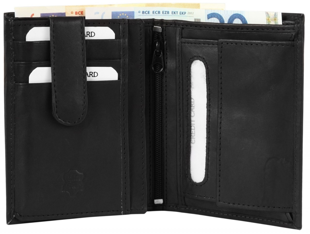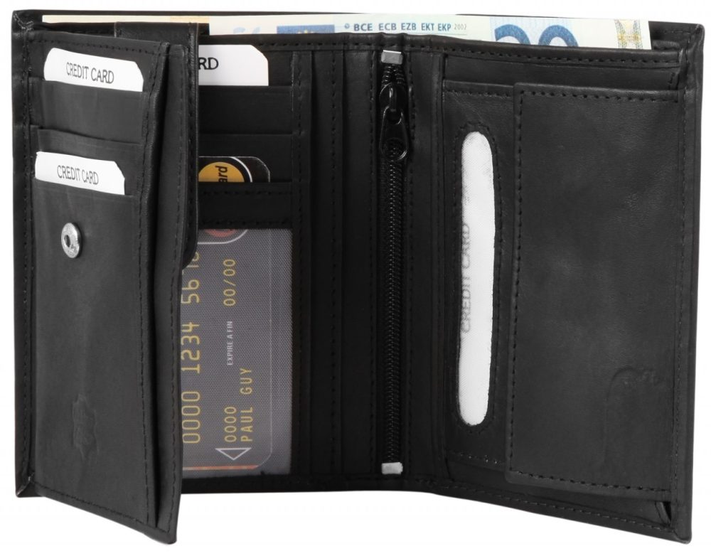 A carteira da marca Excellanc é confeccionada em couro genuíno em formato retrato. Na parte traseira possui dois compartimentos para notas. O compartimento para moedas fica no lado direito. O lado esquerdo é preso com uma pulseira de couro separada que pode ser fechada com um fecho de pressão. Existem três slots para cartões na parte superior. Este estojo de couro pode ser aberto para a esquerda. Embaixo há outro grande compartimento transparente para identificação à esquerda e três compartimentos para cartões e um pequeno compartimento transparente para identificação à direita. Existe um fecho integrado entre o compartimento para moedas e os compartimentos para cartões, atrás do qual existe um grande compartimento que oferece um bom esconderijo em toda a largura da carteira. As dimensões são comprimento de 12,3 cm, largura de 9,3 cm e altura de 2,5 cm.