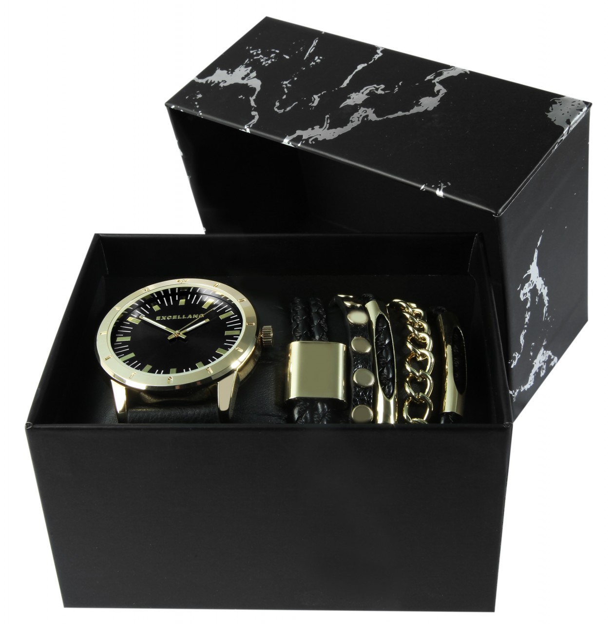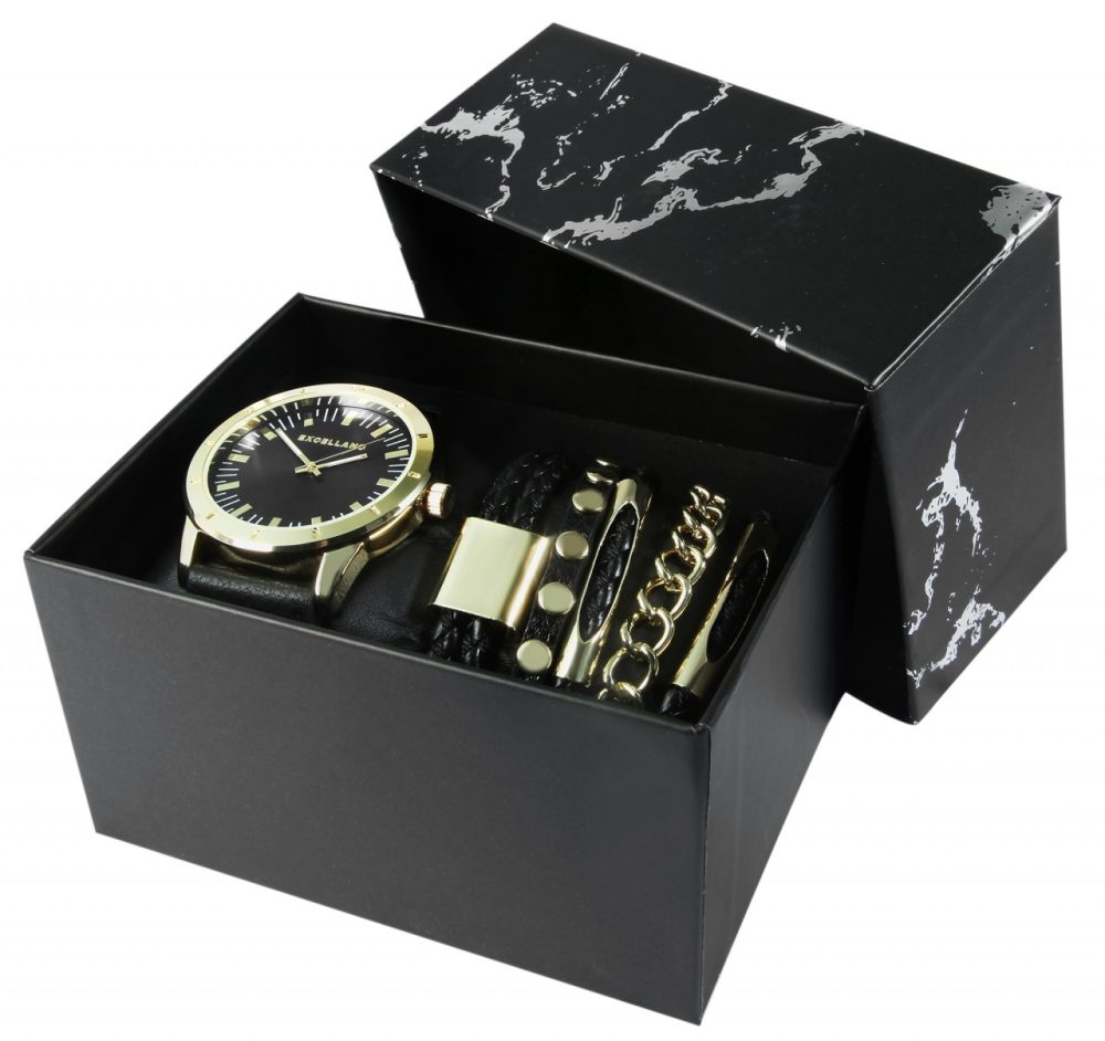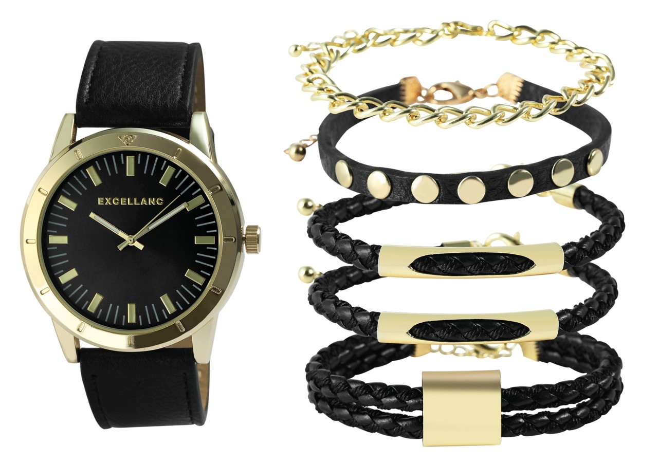 O conjunto de presente da marca Excellanc é composto por um relógio de pulso masculino e cinco pulseiras. As peças de joalheria podem ser usadas de maneira ideal em combinação, pois formam uma unidade harmoniosa.