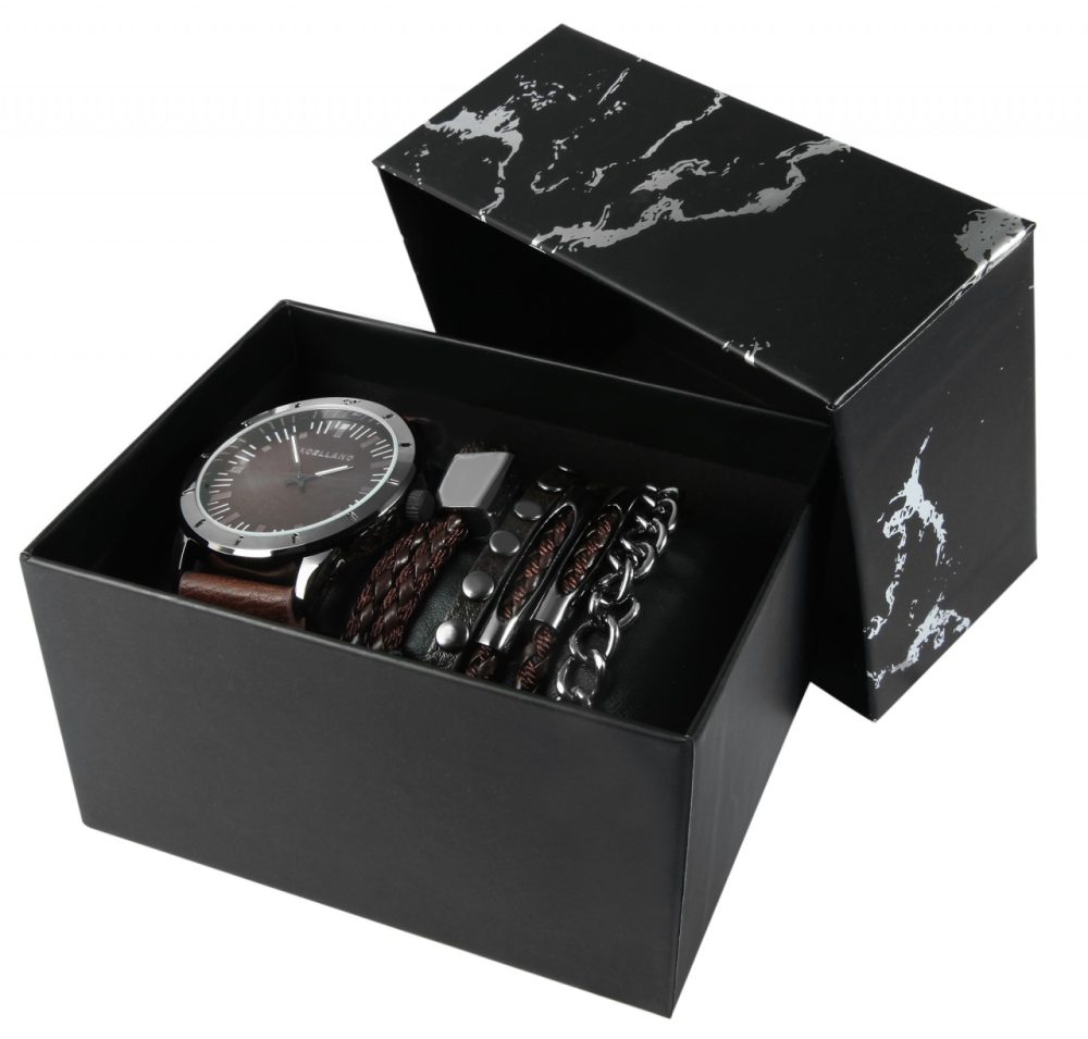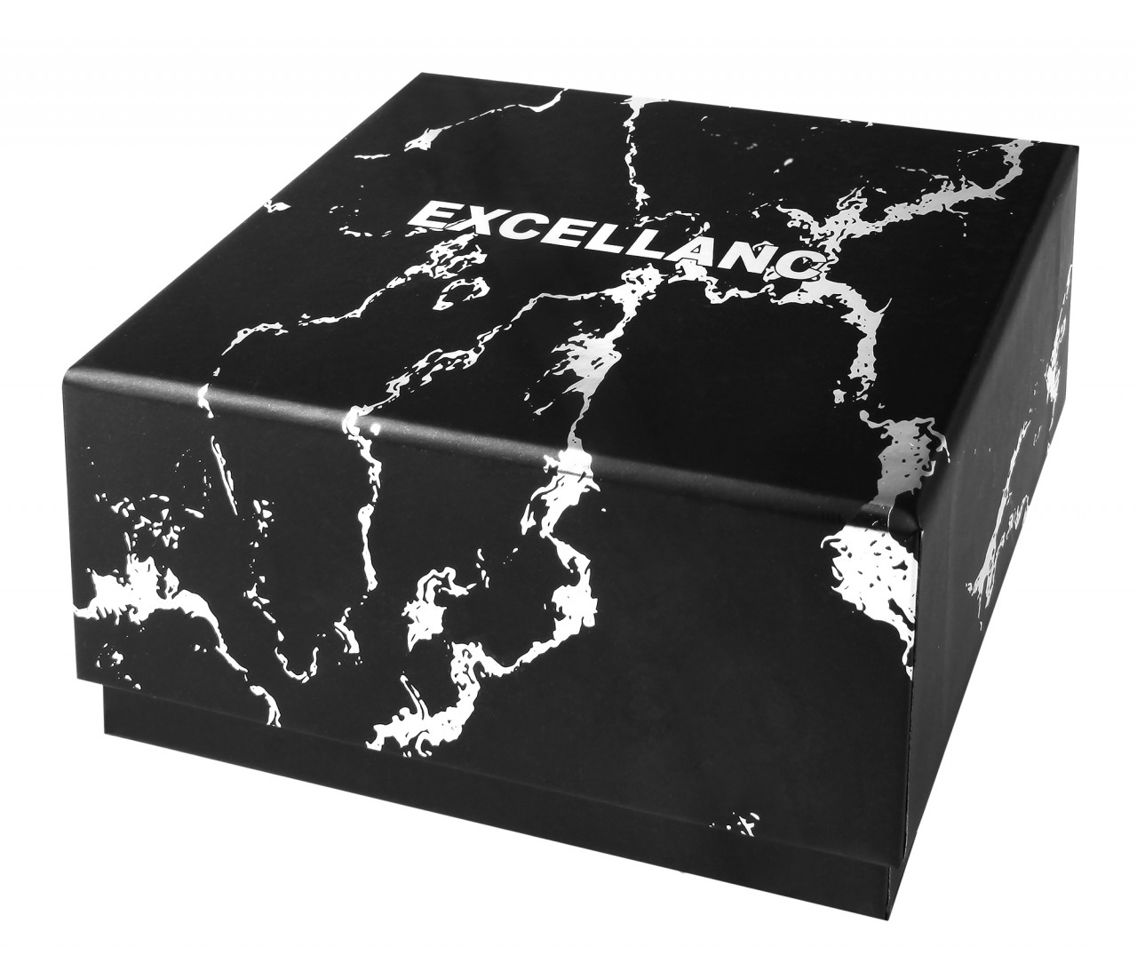 O conjunto de presente da marca Excellanc é composto por um relógio de pulso masculino e cinco pulseiras. As peças de joalheria podem ser usadas de maneira ideal em combinação, pois formam uma unidade harmoniosa. O relógio de pulso analógico de 3 ponteiros para homem possui um movimento de quartzo preciso e de alta qualidade. A bracelete de pele sintética tem 24 mm de largura na alça e pode ser aberta e fechada com uma fivela. A bracelete do relógio garante o máximo conforto e cabe confortavelmente no pulso. O comprimento total do relógio é de 25 cm. A caixa de metal com vidro mineral e moldura distinta exala um acabamento brilhante. Tem uma dimensão de 46 mm de diâmetro e uma altura de caixa de 9,5 mm. O mostrador organizado com divisão de índice de linha permite ler a hora atual de forma rápida e fácil.