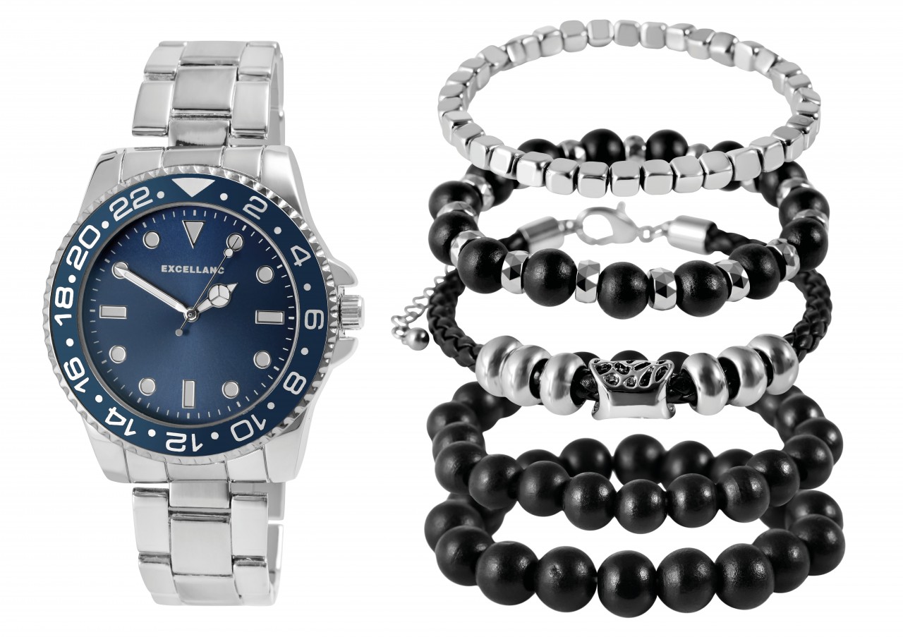 O conjunto de presente da marca Excellanc é composto por um relógio de pulso masculino e cinco pulseiras. As peças de joalheria podem ser usadas de maneira ideal em combinação, pois formam uma unidade harmoniosa. O relógio de pulso analógico de 3 ponteiros para homem possui um movimento de quartzo preciso e de alta qualidade. A bracelete de elos é feita de metal e tem 20 mm de largura na alça. Pode ser aberto e fechado com fecho dobrável. A bracelete, assim como a caixa do relógio, exala um acabamento brilhante e polido. O comprimento total do relógio é de 21 cm. No entanto, devido aos elementos removíveis, o comprimento pode ser ajustado conforme desejado utilizando uma ferramenta apropriada. A caixa de metal com vidro mineral e moldura distinta tem um diâmetro de 42 mm e uma altura de 11,5 mm.
