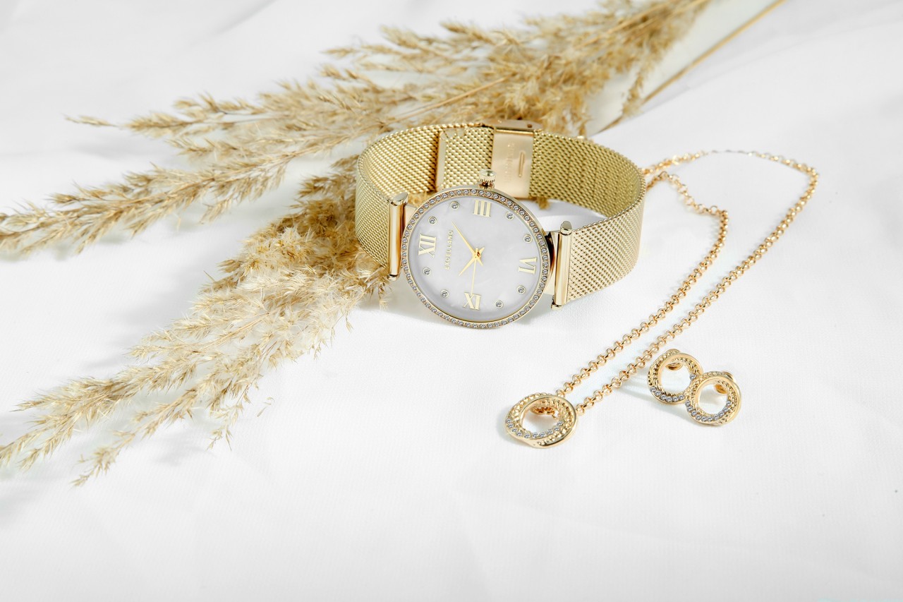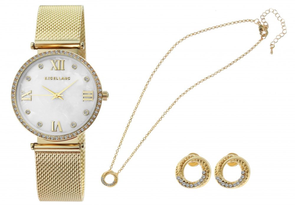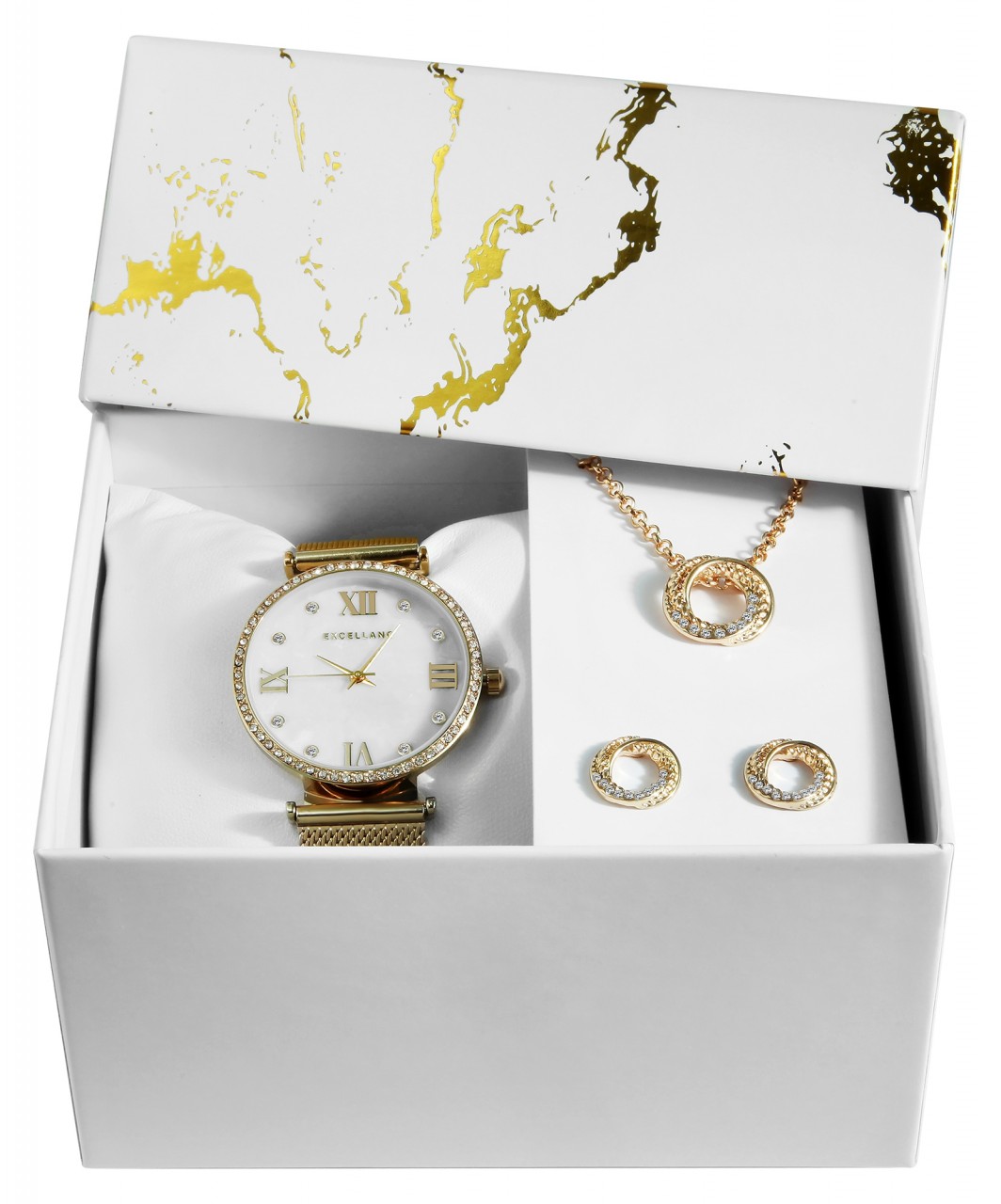 O conjunto de presente da marca Excellanc é composto por um relógio, um colar e um par de brincos. As peças de joalheria têm cores coordenadas e podem ser usadas perfeitamente em combinação ou individualmente. O relógio de pulso feminino analógico de 3 ponteiros possui um movimento de quartzo de alta qualidade e a luneta é decorada em toda a volta com pedras simil brilhantes. A delicada pulseira de malha garante um ajuste confortável e tem 18 mm de largura na alça. O ajuste fino permite um ajuste perfeito a qualquer pulso. É fechado e aberto com um prático fecho de gancho. O comprimento total do relógio é de 23 cm. A caixa de metal com vidro mineral tem um diâmetro de 36 mm e uma altura de 8,5 mm. O fundo da caixa é feito de aço inoxidável. O mostrador é engastado com madrepérola .