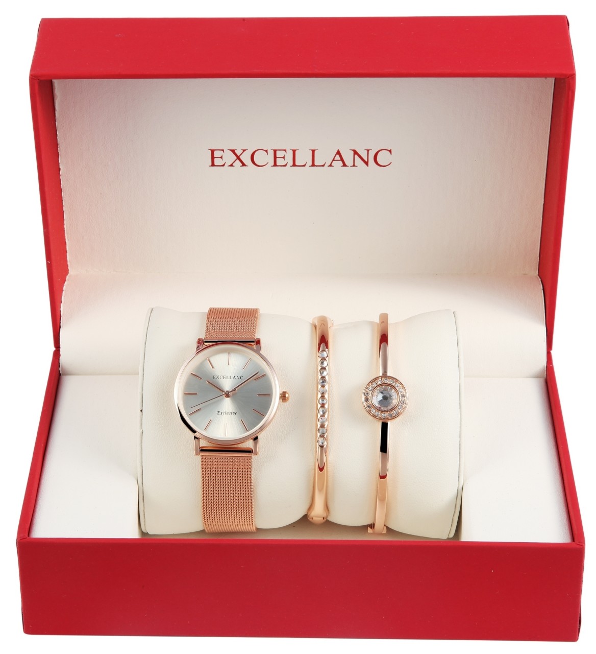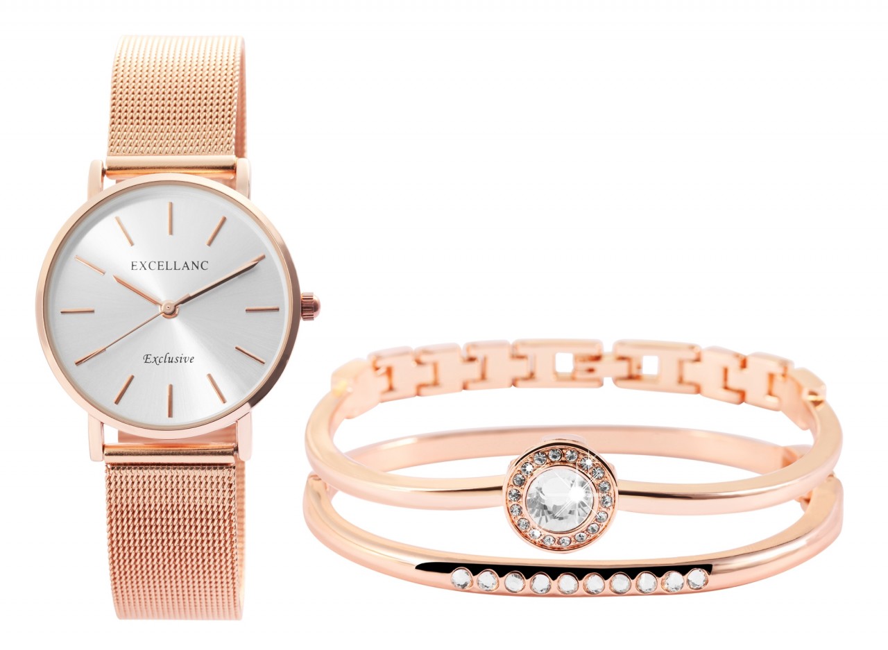 O conjunto oferta da marca Excellanc é composto por um relógio e duas pulseiras. As peças de joalheria têm cores coordenadas e podem ser usadas perfeitamente combinadas. O relógio de pulso feminino analógico de 3 ponteiros possui um movimento de quartzo de alta qualidade. A pulseira milanesa de metal tem 16 mm de largura na alça e pode ser aberta e fechada com um fecho de gancho em aço inoxidável. O comprimento total do relógio é de 22 cm. A caixa de metal com vidro mineral tem um diâmetro de 32 mm e uma altura de 8 mm. O fundo da caixa é feito de aço inoxidável. Os ponteiros e índices são da mesma cor e combinam bem com a aparência geral do relógio. Ambas as pulseiras têm um diâmetro de 5 cm, uma das quais pode ser encurtada. Ambos são decorados com pedras simil brilhantes e por isso atraem a atenção de todos.