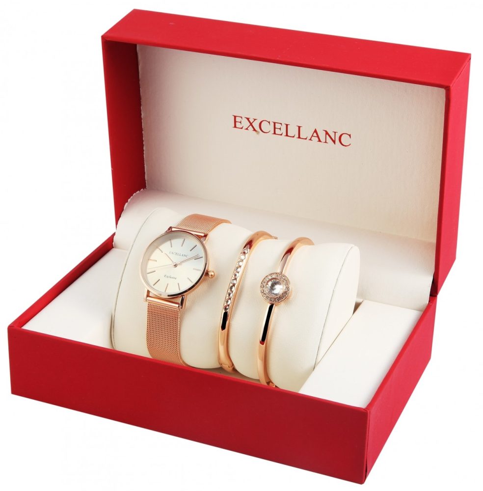 O conjunto oferta da marca Excellanc é composto por um relógio e duas pulseiras. As peças de joalheria têm cores coordenadas e podem ser usadas perfeitamente combinadas. O relógio de pulso feminino analógico de 3 ponteiros possui um movimento de quartzo de alta qualidade. A pulseira milanesa de metal tem 16 mm de largura na alça e pode ser aberta e fechada com um fecho de gancho em aço inoxidável. O comprimento total do relógio é de 22 cm. A caixa de metal com vidro mineral tem um diâmetro de 32 mm e uma altura de 8 mm. O fundo da caixa é feito de aço inoxidável. Os ponteiros e índices são da mesma cor e combinam bem com a aparência geral do relógio. Ambas as pulseiras têm um diâmetro de 5 cm, uma das quais pode ser encurtada. Ambos são decorados com pedras simil brilhantes e por isso atraem a atenção de todos.