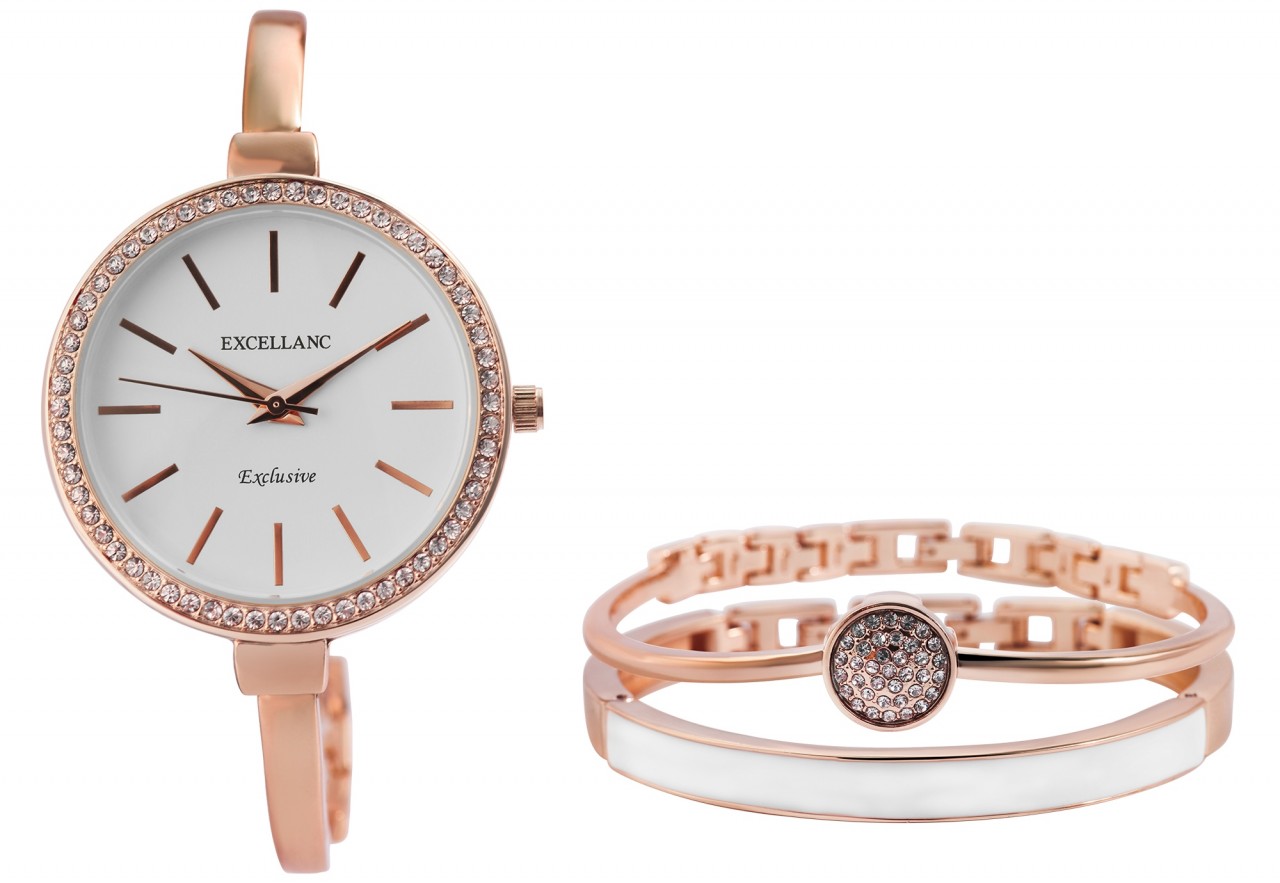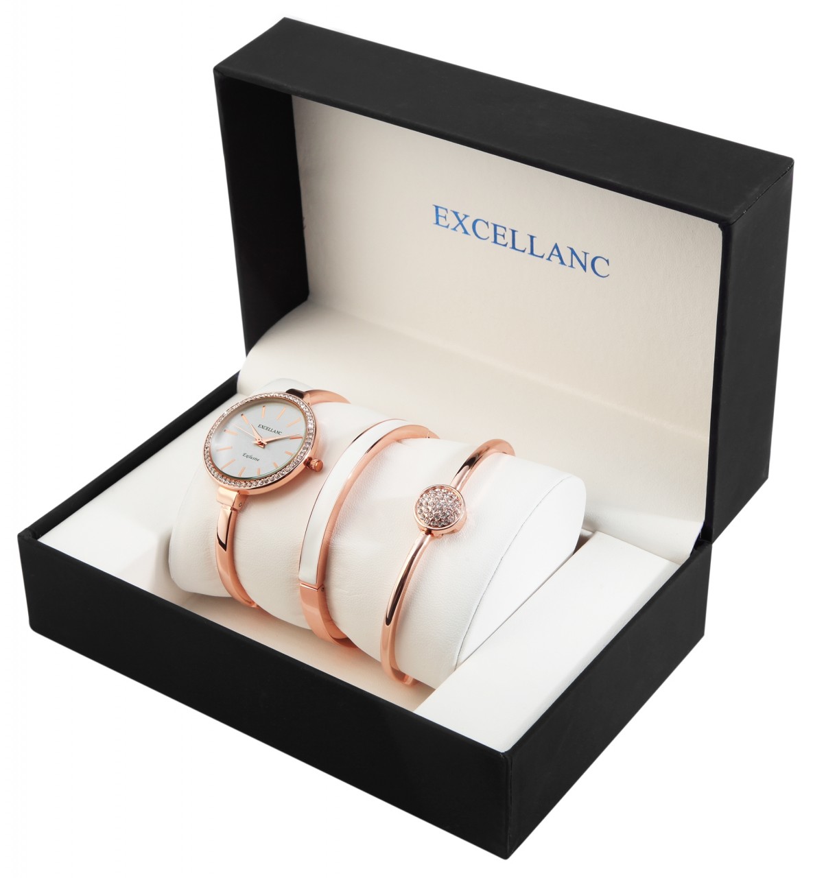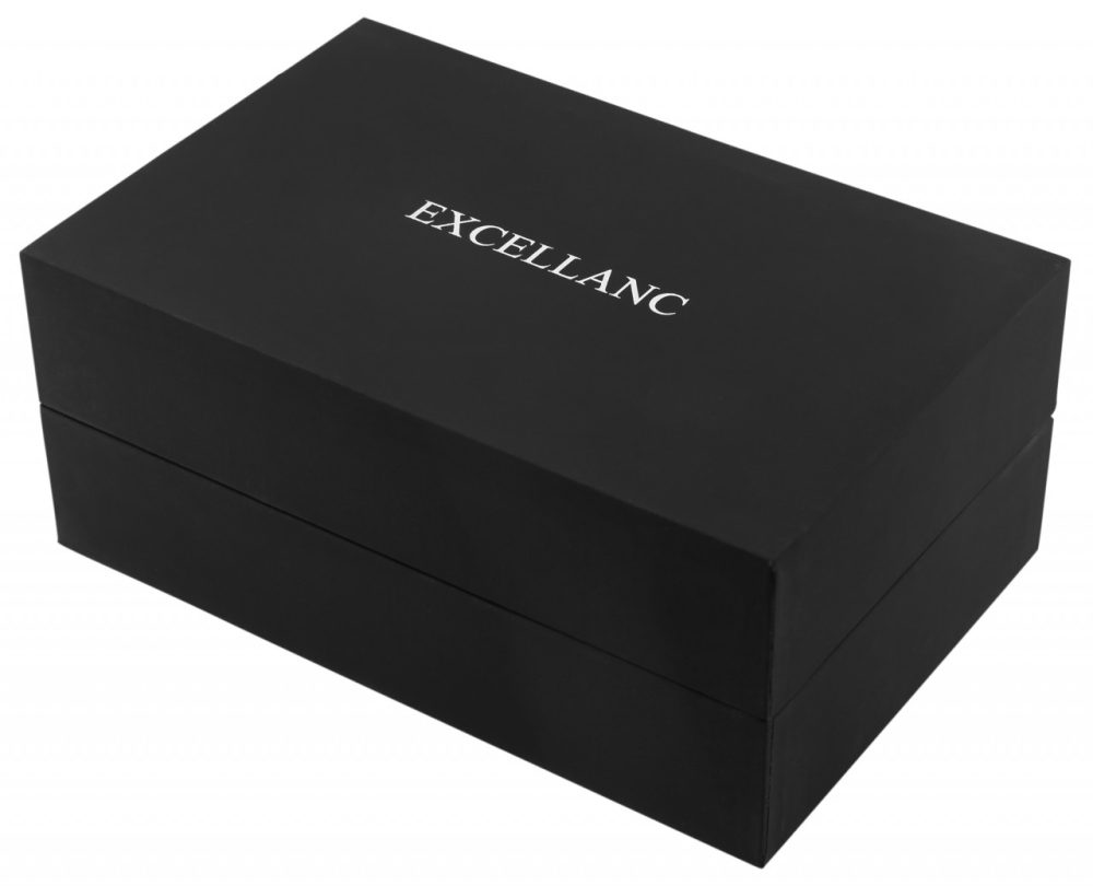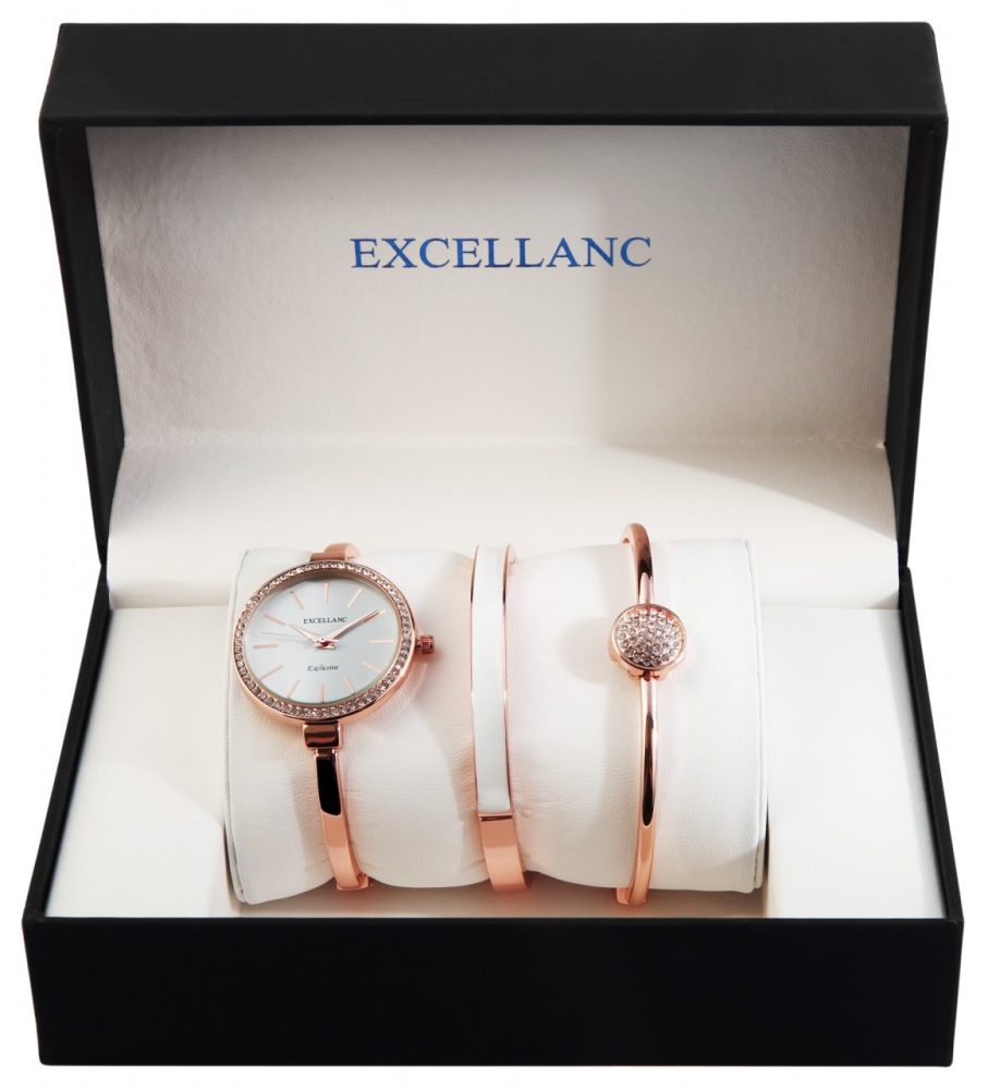 O conjunto de presente da marca Excellanc consiste em um relógio de pulso feminino. A pulseira é uma combinação de fecho e pulseira de elos e fecha com um fecho de clipe. A luneta é incrustada com 60 pedras simil. O conjunto também inclui duas pulseiras. Um deles tem 20 cm de comprimento, 6,5 mm de largura e 4 mm de espessura. A pulseira fecha com clipe e possui um elemento de cor diferente na frente. A segunda pulseira com elemento redondo de 14 mm de diâmetro, decorada com 38 pedras simil, tem 21 cm de comprimento e 3 mm de largura e espessura. O relógio de pulso feminino analógico de 3 ponteiros possui um movimento de quartzo de alta qualidade. A bracelete de metal tem 6 mm de largura na alça e pode ser aberta e fechada com um clipe.