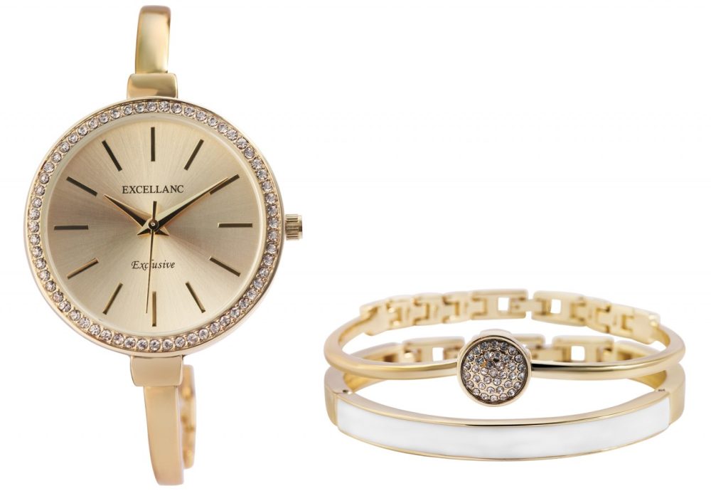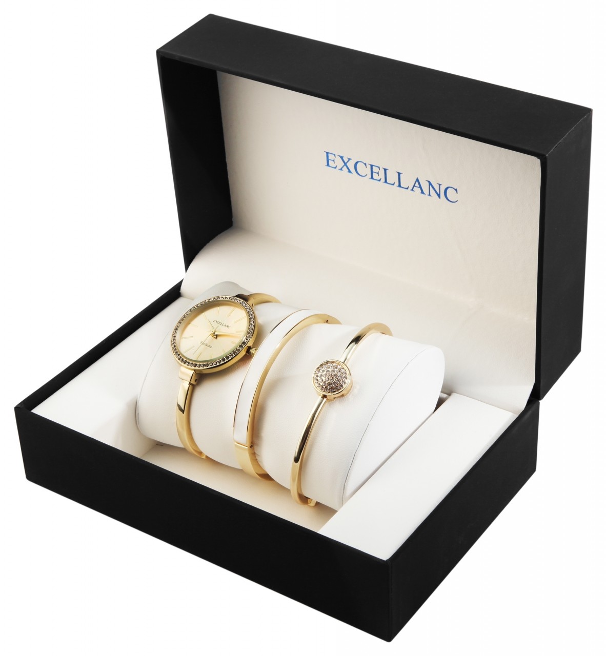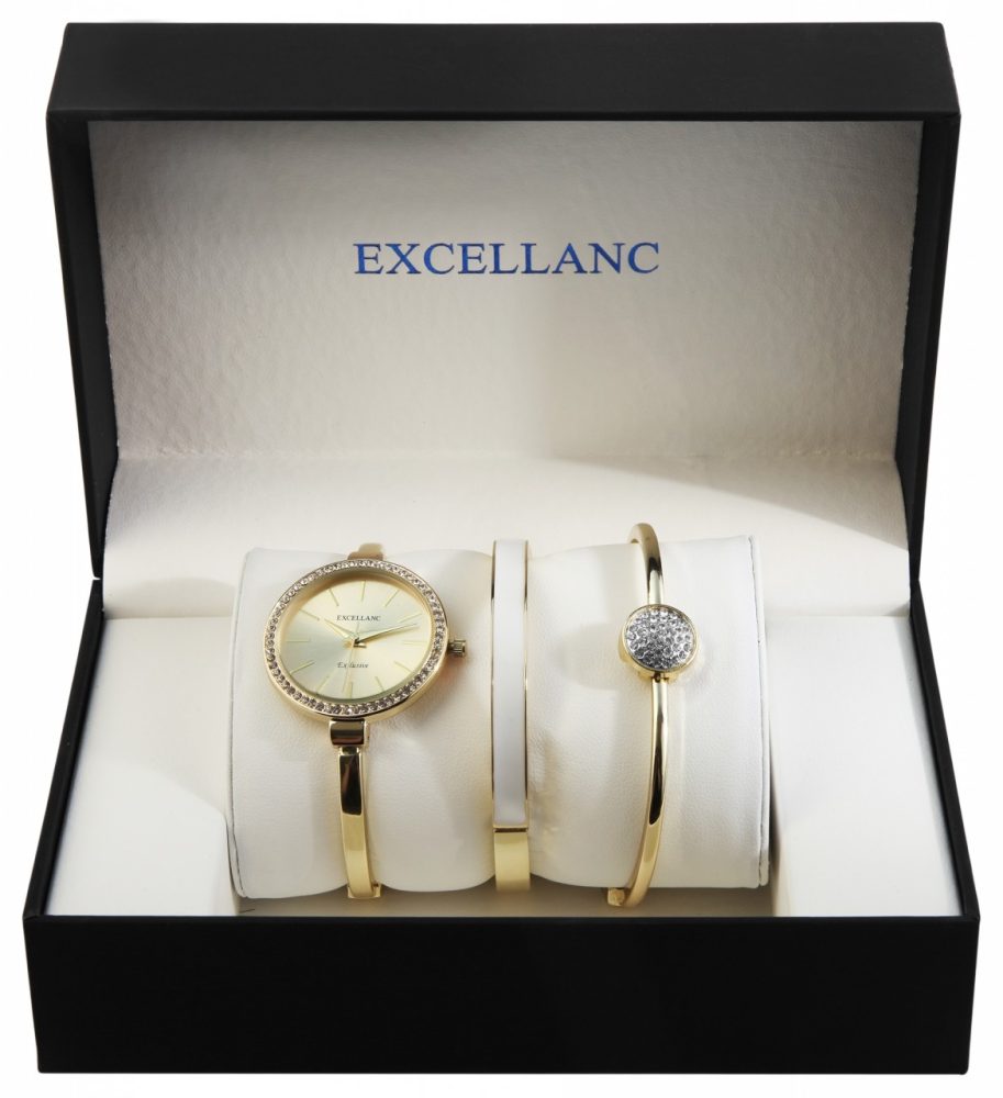 O conjunto de presente da marca Excellanc consiste em um relógio de pulso feminino. A pulseira é uma combinação de fecho e pulseira de elos e fecha com um fecho de clipe. A luneta é incrustada com 60 pedras simili. O conjunto também inclui duas pulseiras. Um deles tem 20 cm de comprimento, 6,5 mm de largura e 4 mm de espessura. A pulseira fecha com clipe e possui um elemento de cor diferente na frente. A segunda pulseira com elemento redondo de 14 mm de diâmetro, decorada com 38 pedras simili, tem 21 cm de comprimento e 3 mm de largura e espessura. O relógio de pulso feminino analógico de 3 ponteiros possui um movimento de quartzo de alta qualidade. A pulseira de metal tem 6 mm de largura na alça e pode ser aberta e fechada com um fecho de clipe. O comprimento total do relógio é de 18 cm.
