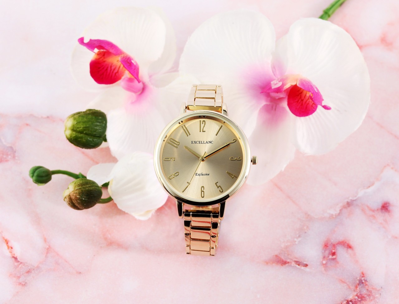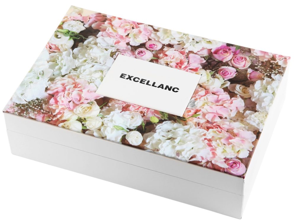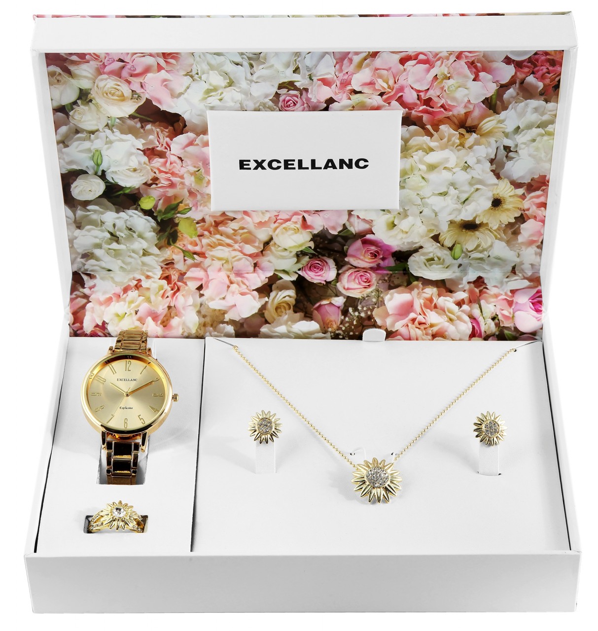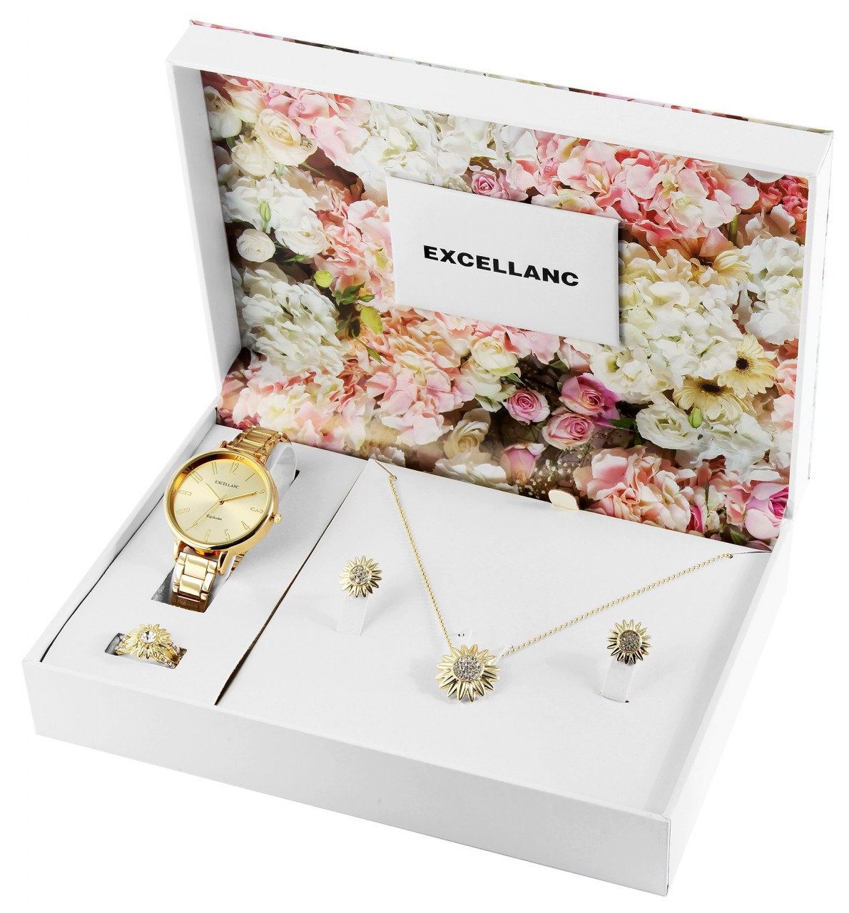 O conjunto de presente da marca Excellanc consiste em um relógio de pulso feminino, um colar, um par de brincos e um anel de dedo. O padrão de uma flor pode ser encontrado no pingente do colar, nos brincos e no anel e completa a combinação harmoniosa de todas as peças de joalheria, que são entregues em uma prática caixa dobrável. O núcleo da flor do colar é decorado com 19 pedras simili, os brincos são decorados cada um com sete pedras simili e o anel tem uma grande pedra simili. Além disso, é decorado com 14 símbolos adicionais na faixa do anel. O anel também possui uma faixa aberta para que possa ser redimensionado. O…