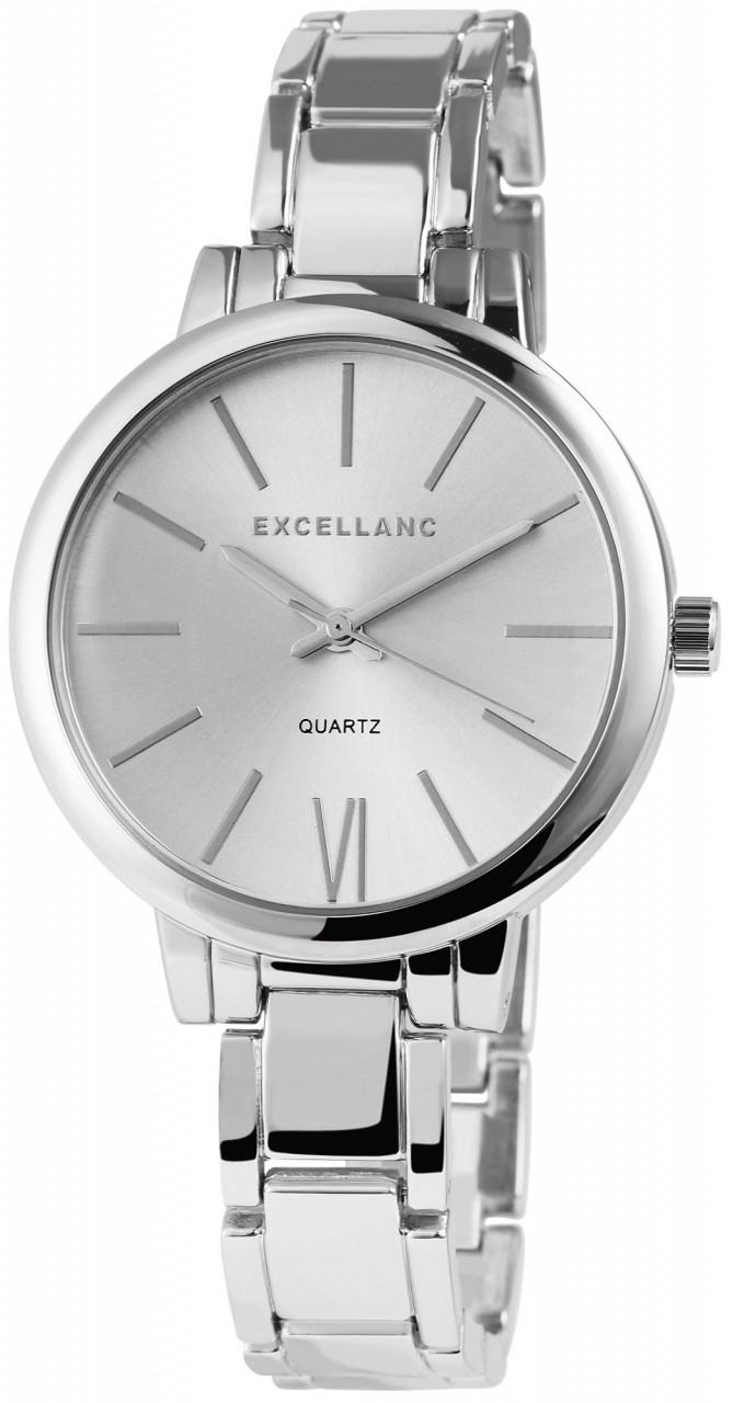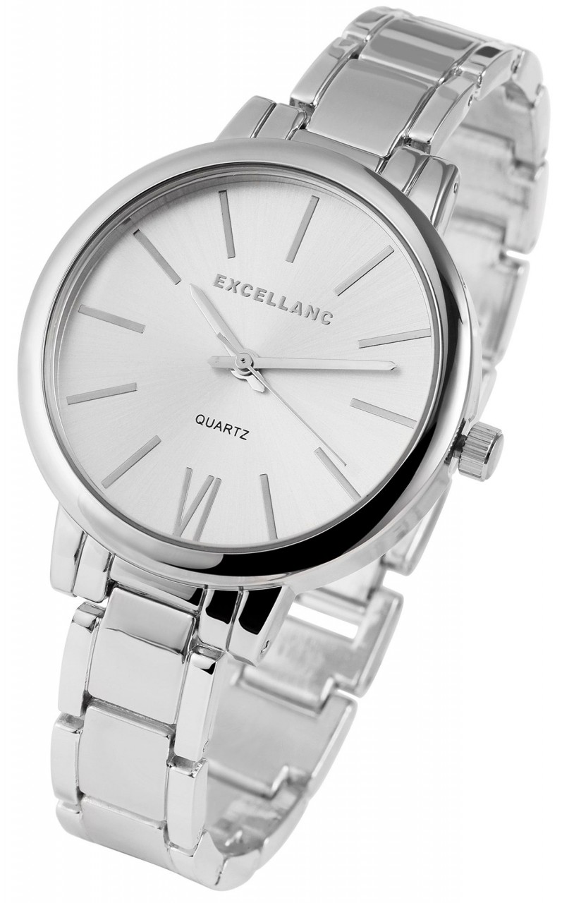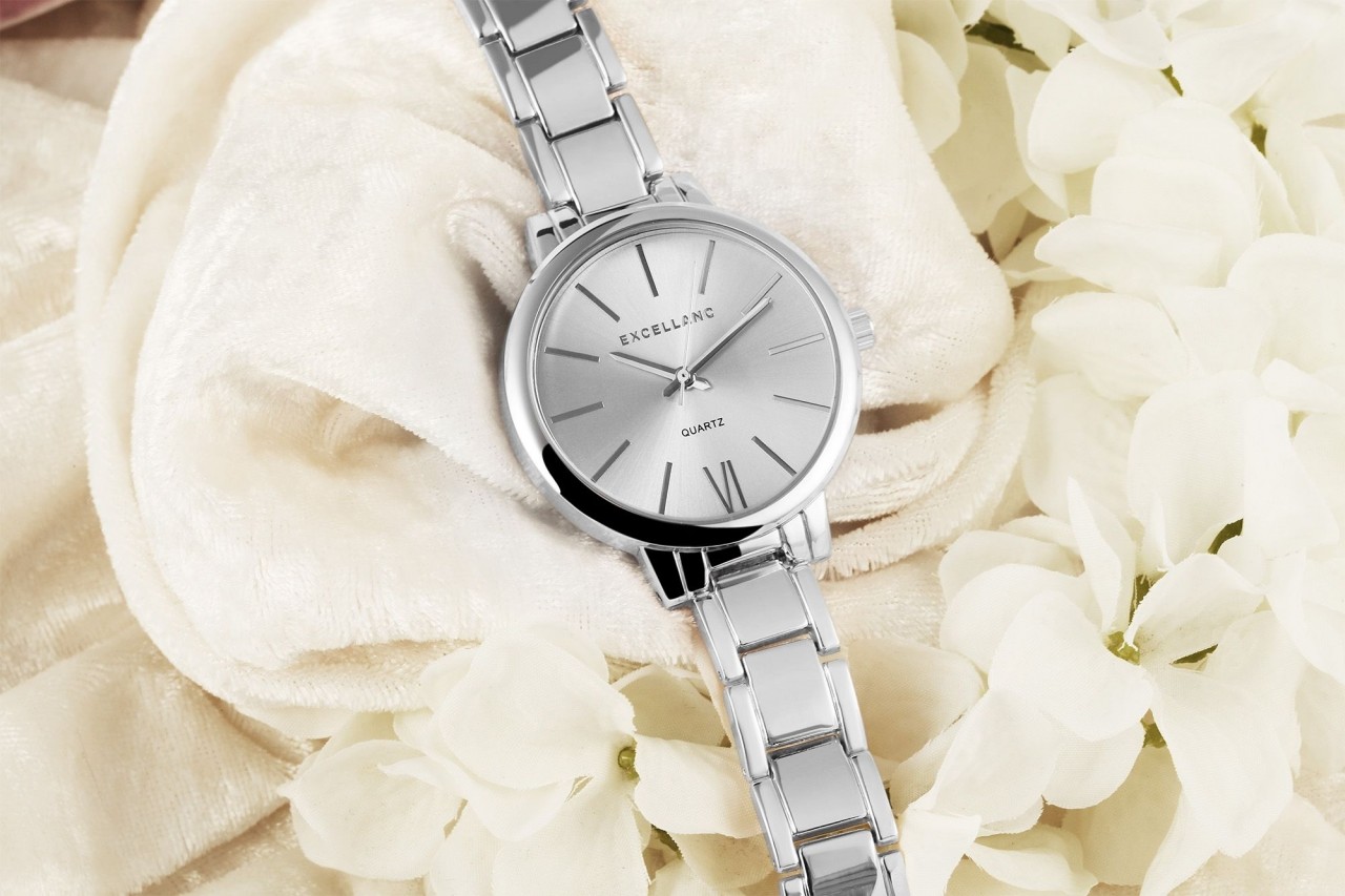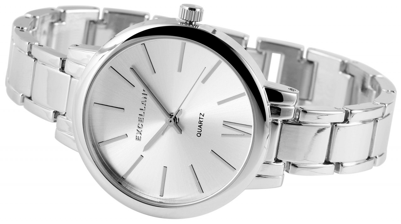 O relógio analógico feminino da marca Excellanc tem um movimento de quartzo de alta qualidade. O nome do modelo é EX0113. A pulseira de metal tem 13 mm de largura e abre com um fecho de pressão. O comprimento total é de 16,5 cm. A caixa de metal com vidro mineral tem uma dimensão de 37 mm e uma altura de caixa de 10 mm. A tampa da caixa é feita de aço inoxidável.