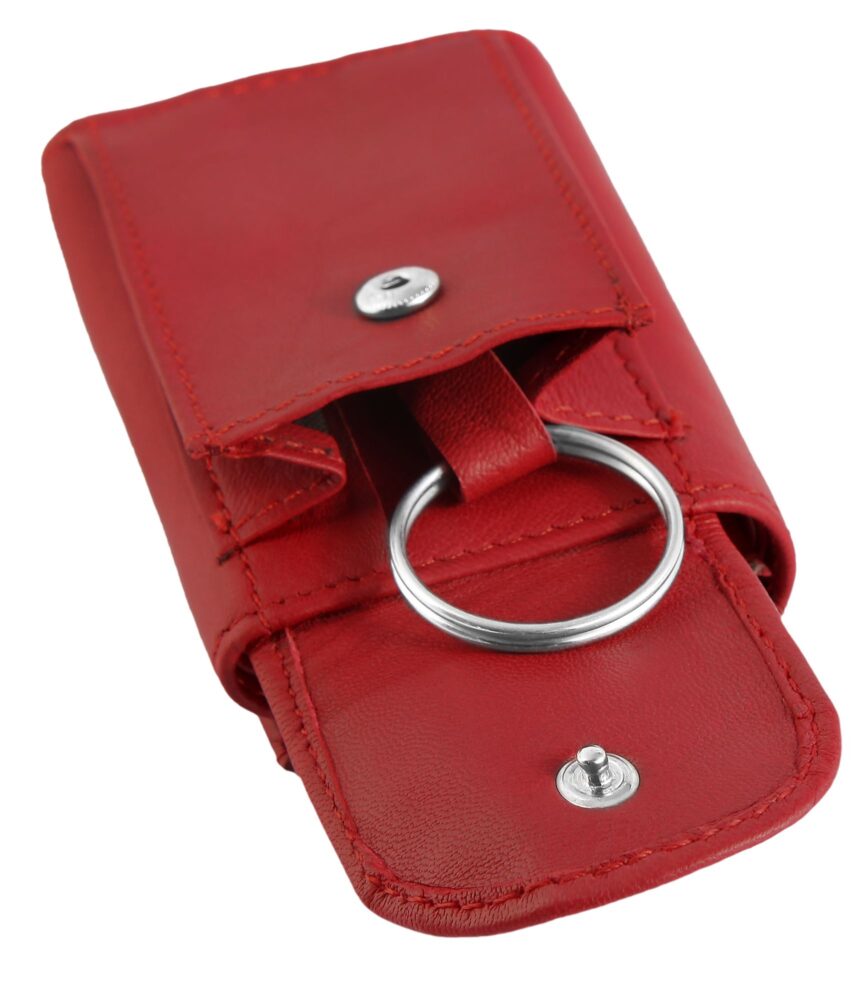 - A carteira tem 2 compartimentos para notas, 1 compartimento para moedas com fecho de pressão e 1 prático compartimento para chaves. Neste compartimento para chaves, existe um porta-chaves com um diâmetro de 25 mm numa tira de couro com cerca de 7 cm de comprimento. É ideal para prender chaves, que podem ser guardadas de forma prática.