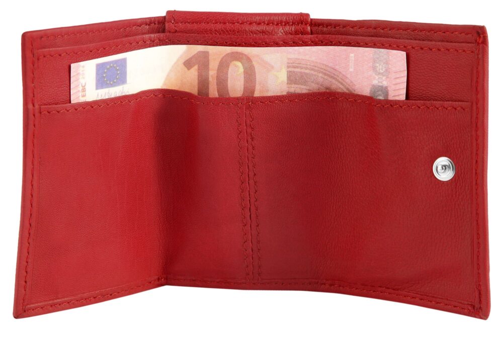 - A mini carteira vermelha escura em formato de retrato da marca Excellanc é feita de couro genuíno.