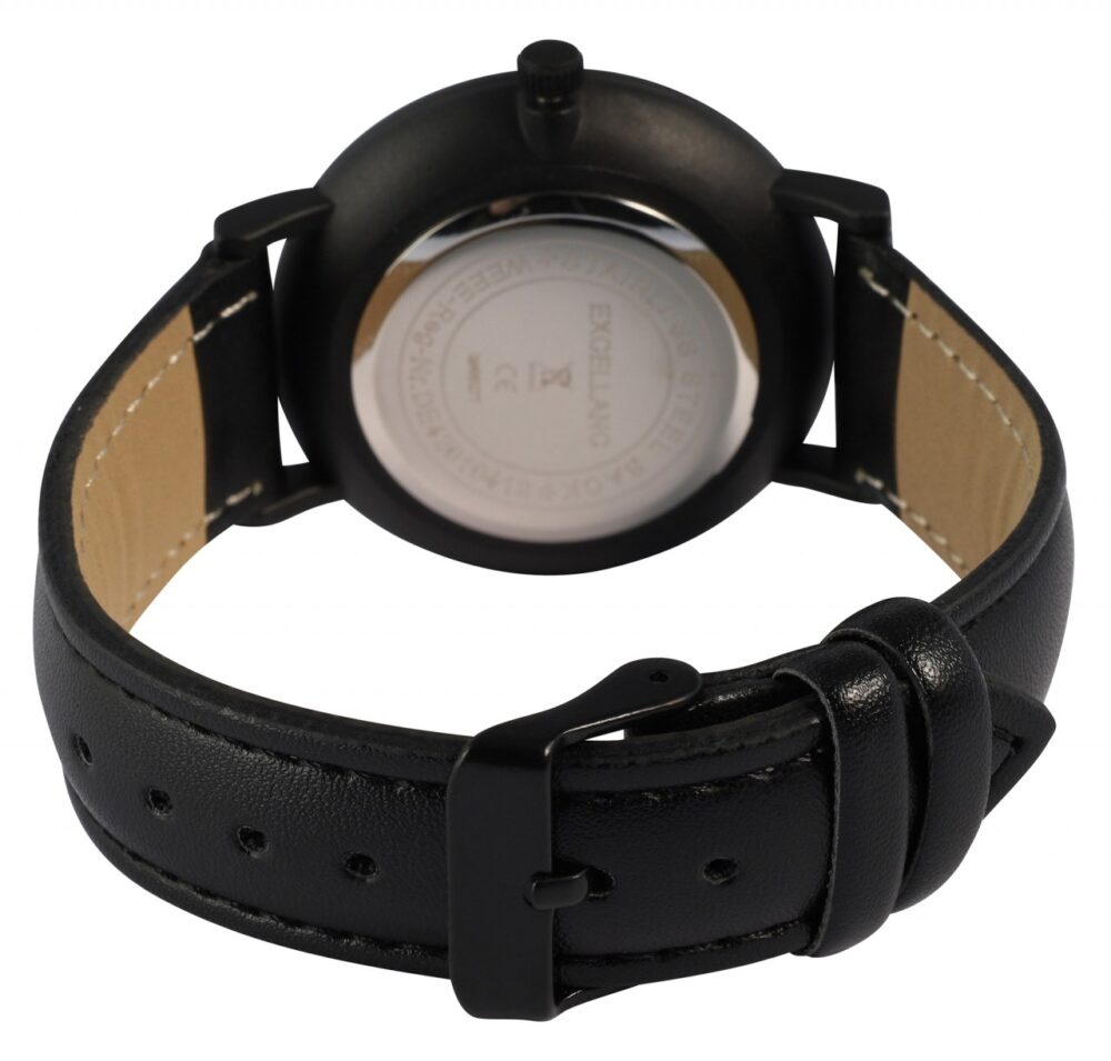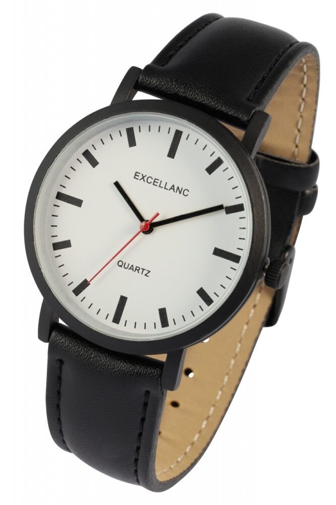 Este relógio de pulso Excellanc para homem tem uma bracelete em imitação de pele, ligeiramente forrada, com uma espessura de 4 mm e uma largura de ponte de 20 mm. O relógio é preso com uma fivela de pino. O comprimento total da bracelete e do relógio é de 24 cm. O relógio possui um movimento de quartzo de alta qualidade, um índice de barras moderno com uma cobertura de vidro mineral e o aspeto típico de três ponteiros deste tipo de relógio. O diâmetro do relógio redondo é de 40 mm. Esta peça de joalharia simples é adequada para negócios e lazer.