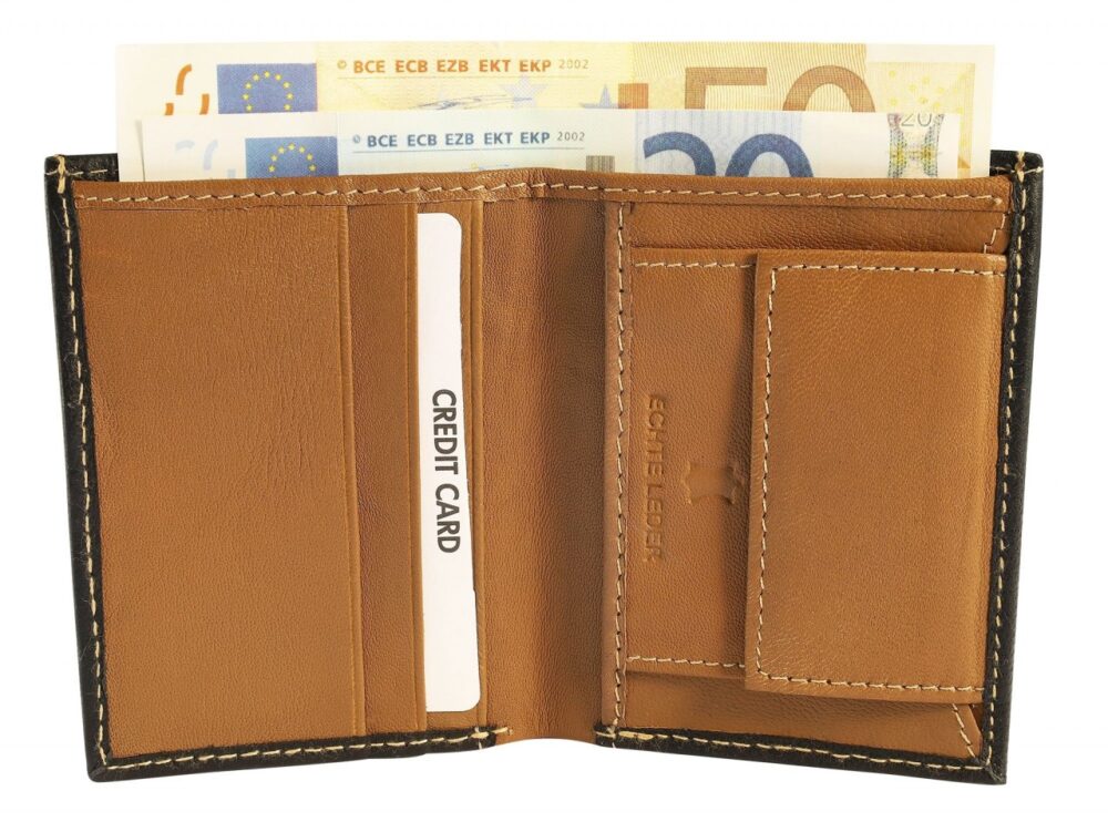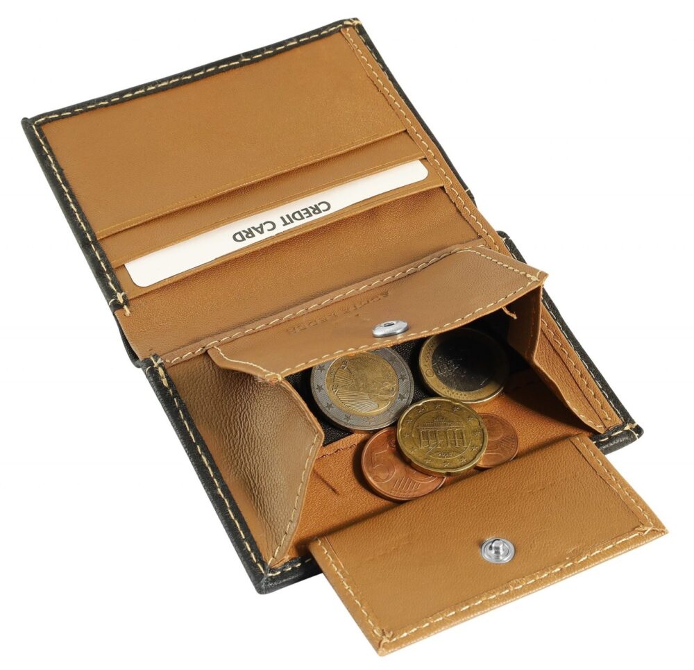 - A carteira tem 1 compartimento para notas, 1 compartimento para moedas com fecho de pressão, 2 compartimentos para cartões de crédito e 3 bolsos.