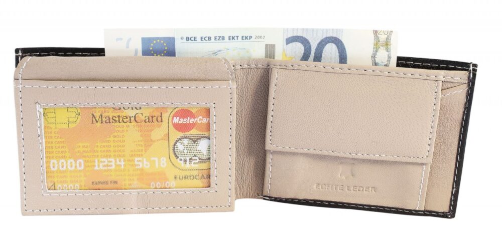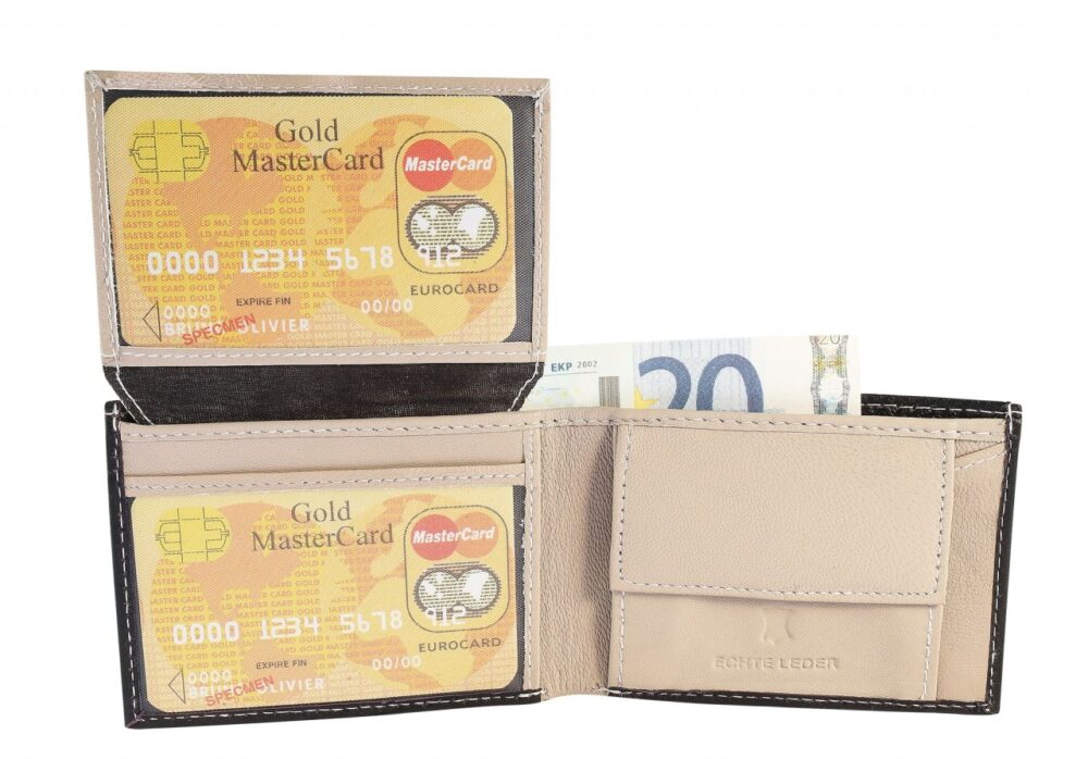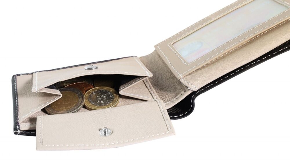 - A carteira tem 1 compartimento para notas, 1 compartimento para moedas com fecho de pressão, 3 compartimentos para cartões de crédito e 2 bolsos.