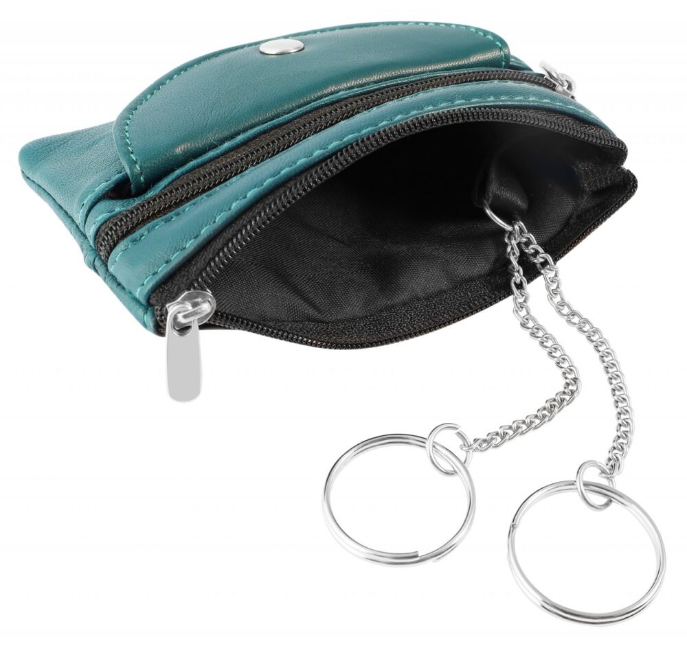 A bolsa para chaves da marca Excellanc é fabricada em pele genuína. O forro interior é feito de poliéster. Dois práticos porta-chaves com um diâmetro de 25 mm estão ligados à bolsa para chaves. Estes estão ligados ao interior da bolsa através de duas tiras de couro com cerca de 2 cm de comprimento. São ideais para prender chaves ou pendentes, mas também para prender a malas ou quadros de chaves. A bolsa para chaves tem um grande compartimento interior e um bolso com fecho de correr no exterior. Existe também um outro compartimento com um fecho de pressão por baixo do compartimento com fecho de correr. A bolsa tem um comprimento de 8 cm, uma largura de 11,8 cm e uma espessura de 1 cm. A bolsa para chaves é perfeita para guardar as chaves. Os trocos e os cartões também podem ser convenientemente guardados.