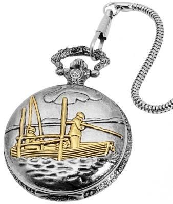 O relógio de bolso analógico de 3 ponteiros da marca Excellanc possui um movimento de quartzo de alta qualidade. A caixa redonda em metal está decorada com um padrão floral na parte de trás. A parte frontal mate está decorada com um pescador num barco no centro. O relógio de bolso clássico pode ser aberto com um botão de pressão integrado na coroa. Uma corrente de relógio de bolso de 30 cm de comprimento com um padrão de serpente é fixada ao relógio de bolso, permitindo que este seja preso de forma segura a uma mala ou peça de vestuário. O mostrador do relógio é branco e apresenta grandes algarismos árabes pretos. Estes acentuam o aspeto clássico do relógio de bolso e facilitam particularmente a leitura das horas. O relógio está igualmente equipado com um vidro de plástico ligeiramente curvo. O relógio tem um diâmetro de 47 mm e uma altura de caixa de 16 mm.