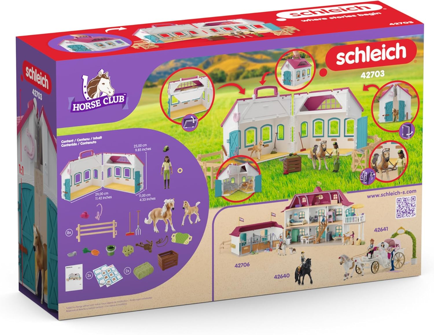 - O estábulo pode ser dobrado formando uma mala e, quando fechado, cabe seis cavalos. As peças pequenas podem ser guardadas no compartimento extra debaixo do teto para que não se perdam. Ideal para transportar!