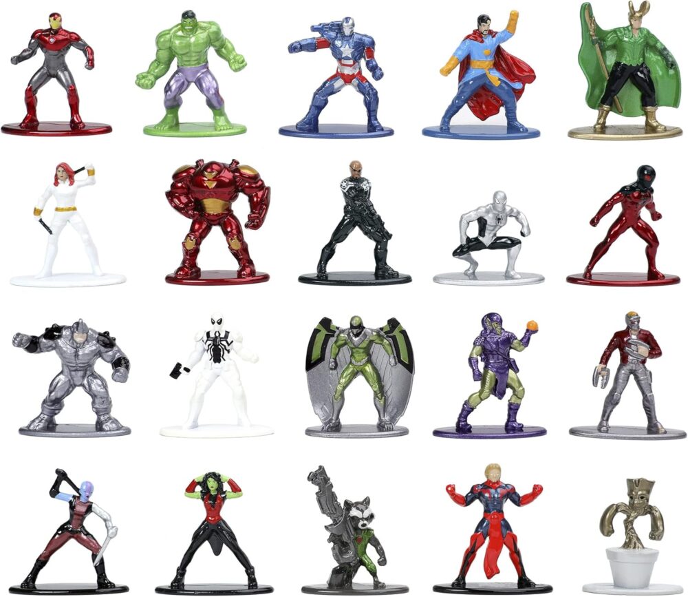- 20 Nano Figuras em metal de 4 cm representando personagens famosos do universo Marvel incluindo, Armored Spider-Man, Black Widow, Doctor Strange, Hulk, Iron Man, Green Goblin, Nick Fury, Nebula, Scarlet Spider, Loki, Rhino, Rocket, Agent Anti-Venom, Adam Warlock, Hulkbuster, Vulture, Groot, Star-Lord, Iron Patriot, Mantis.