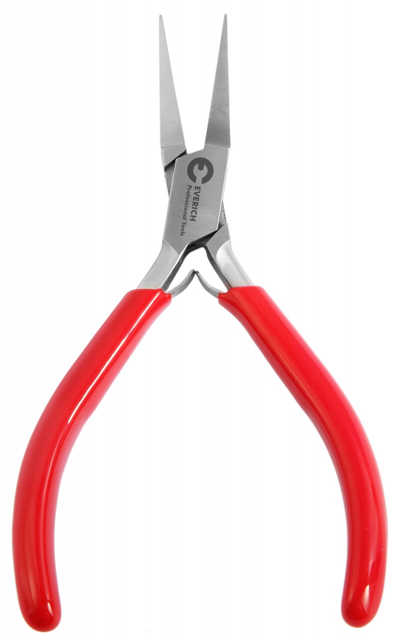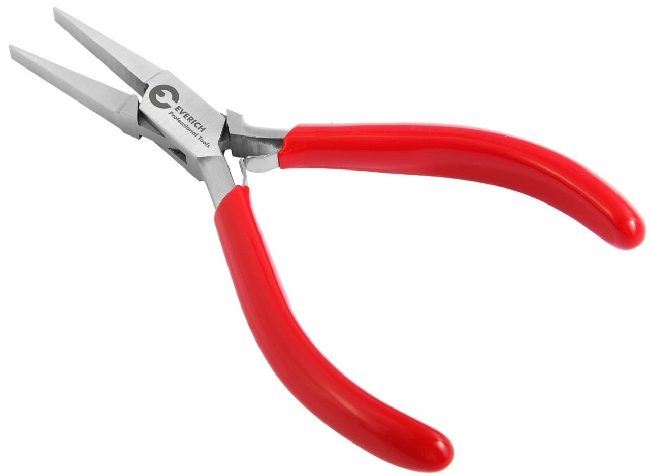 O alicate de ponta chata é feito de aço inoxidável e cabe particularmente bem na mão graças aos cabos revestidos de plástico vermelho. É adequado para dar formas diferentes a peças de trabalho feitas de uma ampla variedade de materiais ou para segurá-las com segurança e firmeza.
