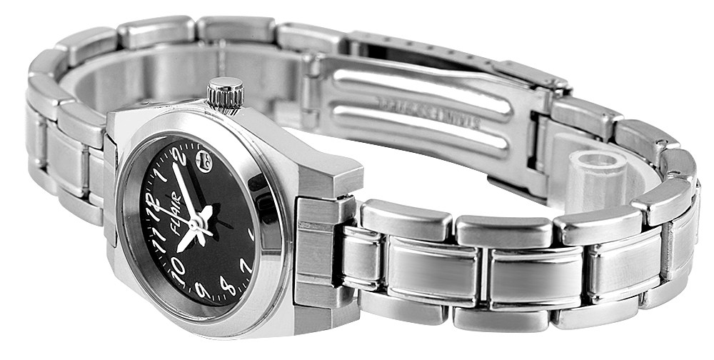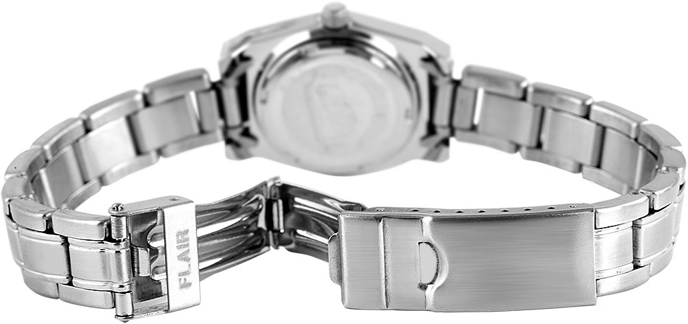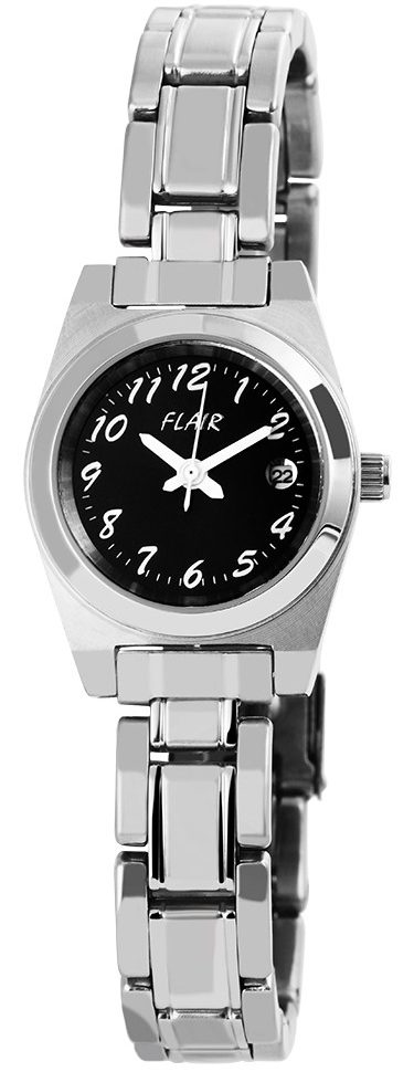 O relógio analógico de senhora Flair possui um movimento de quartzo de alta qualidade. A bracelete em aço inoxidável tem 12 mm de largura e abre-se com um fecho desdobrável em aço inoxidável. O comprimento total é de 20 cm. A caixa em aço inoxidável com vidro mineral mede 26 mm e tem 10 mm de altura. A tampa da caixa é feita de aço inoxidável. O relógio é testado à pressão até 5 ATM. O relógio de senhora Flair tem as seguintes características: Indicação da data.