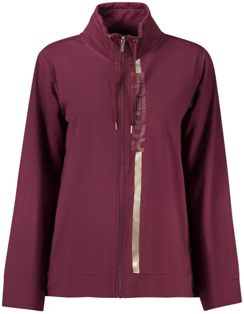 Casaco de manga comprida estilo camisola, com 2 bolsos, fecho de correr, aplicação de strass e logótipo em destaque.